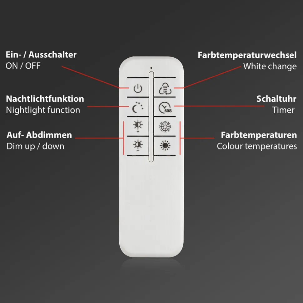 Naast het aantrekkelijke uiterlijk overtuigt Frame ook met praktische functies die via de meegeleverde afstandsbediening kunnen worden bediend en geactiveerd. De lichtkleur kan worden gewijzigd van warm naar universeel wit en ook de helderheid kan worden aangepast aan individuele behoeften. Bovendien zijn een timer en een nachtlichtfunctie beschikbaar.