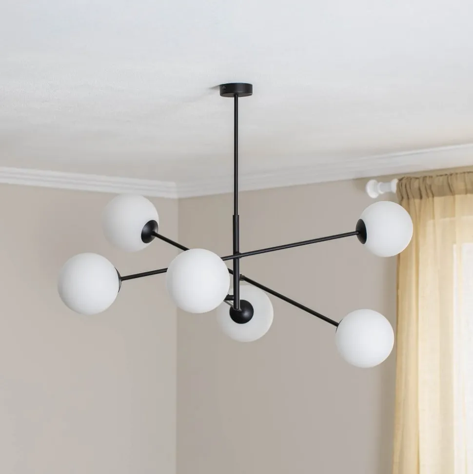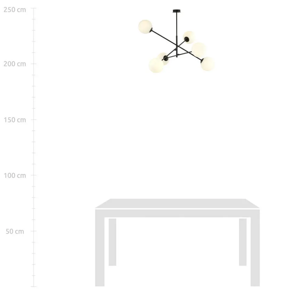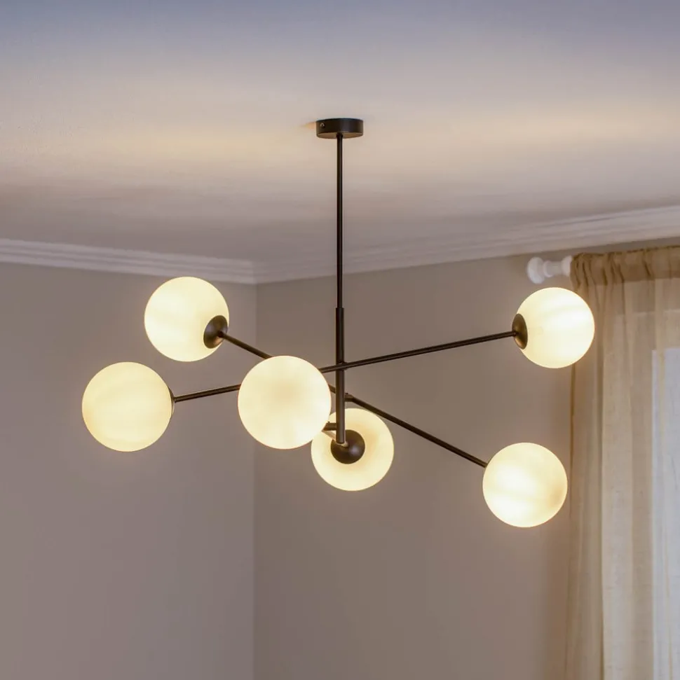 De plafondlamp Linear in zwart en opaal combineert modern design met functionele verlichting. Hij is gemaakt van gepoedercoat staal en glas en biedt een robuuste en tegelijkertijd stijlvolle oplossing voor verschillende woonruimtes, zoals de woonkamer, hal en eetkamer. De 6-lamps constructie zorgt voor een gelijkmatige verlichting en legt elegante accenten in de ruimte.