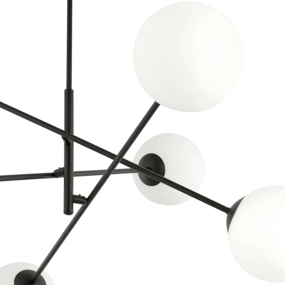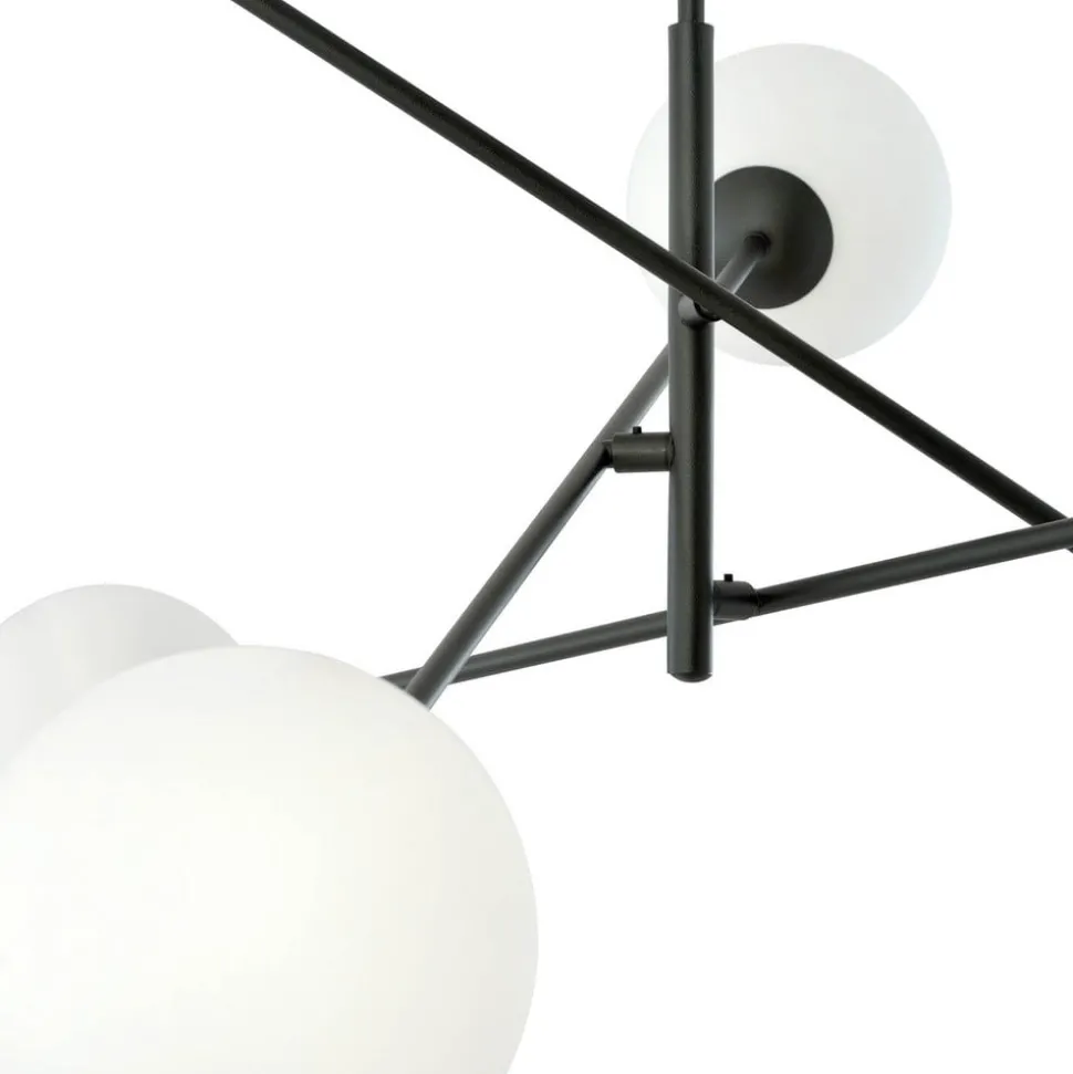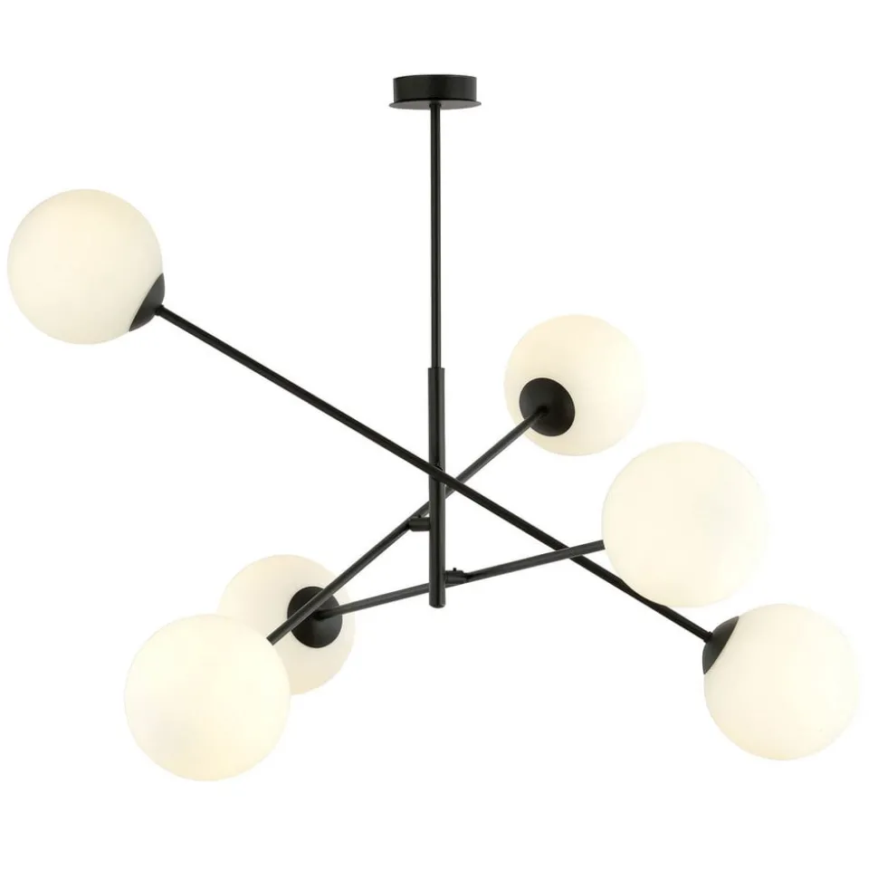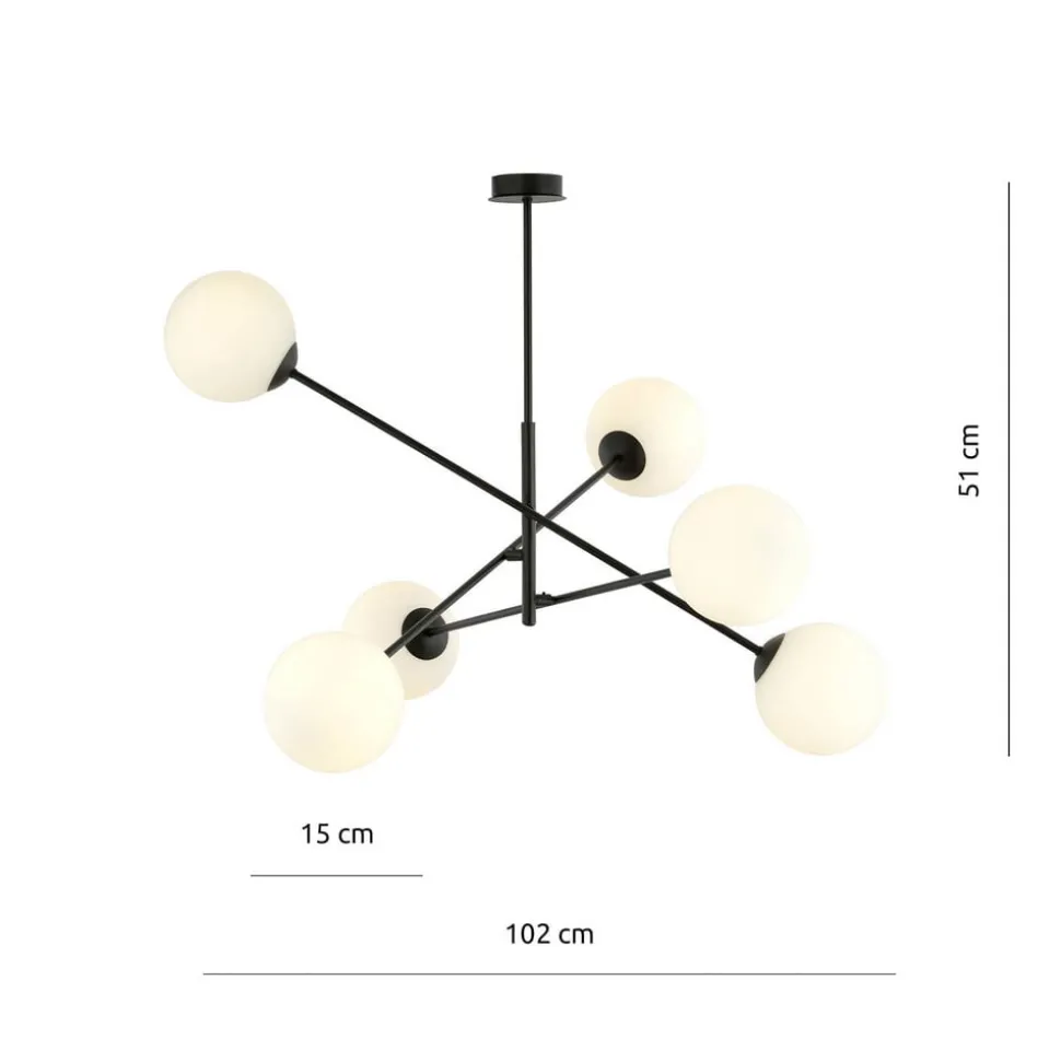 De plafondlamp Linear in zwart en opaal combineert modern design met functionele verlichting. Hij is gemaakt van gepoedercoat staal en glas en biedt een robuuste en tegelijkertijd stijlvolle oplossing voor verschillende woonruimtes, zoals de woonkamer, hal en eetkamer. De 6-lamps constructie zorgt voor een gelijkmatige verlichting en legt elegante accenten in de ruimte.