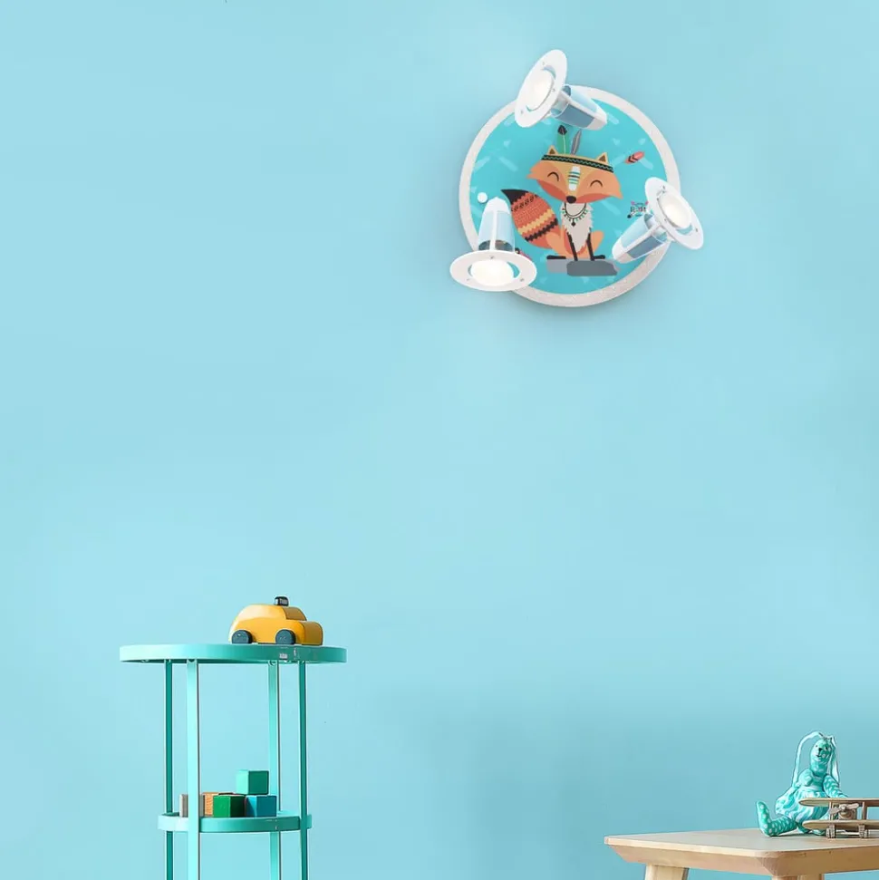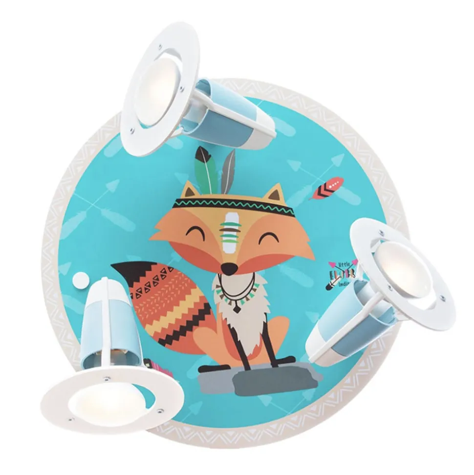 De plafondlamp Little Indians is een ronde houten lamp met drie beweegbare lichtbronnen. Het kindvriendelijke motief toont de vos Filip in Indiaanse stijl, die versierd is met een veerhoofdtooi.