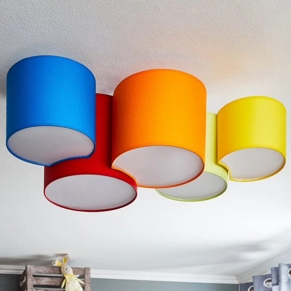 De plafondlamp Mona 5-lamps, meerkleurig, combineert een modern design met levendige kleuren. Deze lamp is gemaakt van een combinatie van metaal, textiel en kunststof en brengt een dynamisch kleurenspel in elke ruimte. De kleuren rood, oranje, blauw, groen en geel creëren een unieke sfeer die zowel in de slaapkamer als in de woonkamer of eetkamer accenten legt.
