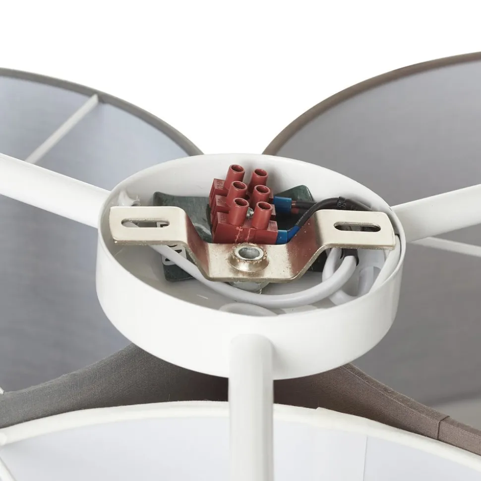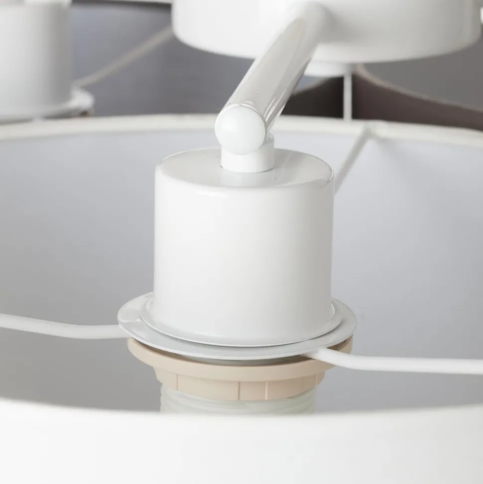 De plafondlamp overtuigt vooral door haar vorm die niet alleen in verschillende groottes, maar ook in verschillende hoogtes beschikbaar is. Alle lampenkappen steken op verschillende afstanden de kamer in, waardoor de lamp aan optische diepte wint. De textielbekleding in het onderste gedeelte van het licht schijnt enigszins gedempt in de kamer, maar verliest niet aan helderheid.