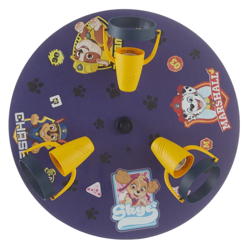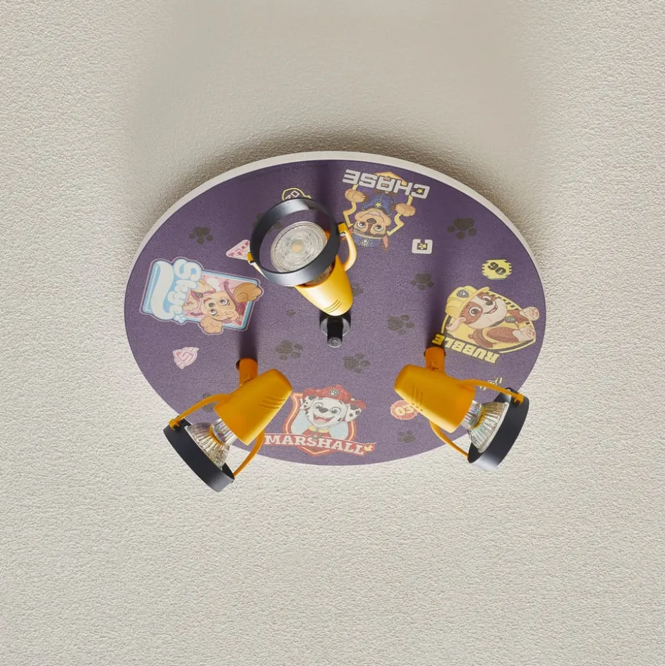 De ronde plafondplaat van deze lamp is bedrukt met vier karakters uit de populaire Canadese animatieserie “Paw Patrol”. De drie schijnwerpers van gele kunststof kunnen variabel worden uitgelijnd en zijn voorzien van GU10 lampen. De armatuur is ideaal voor het verlichten van de kinderkamer.