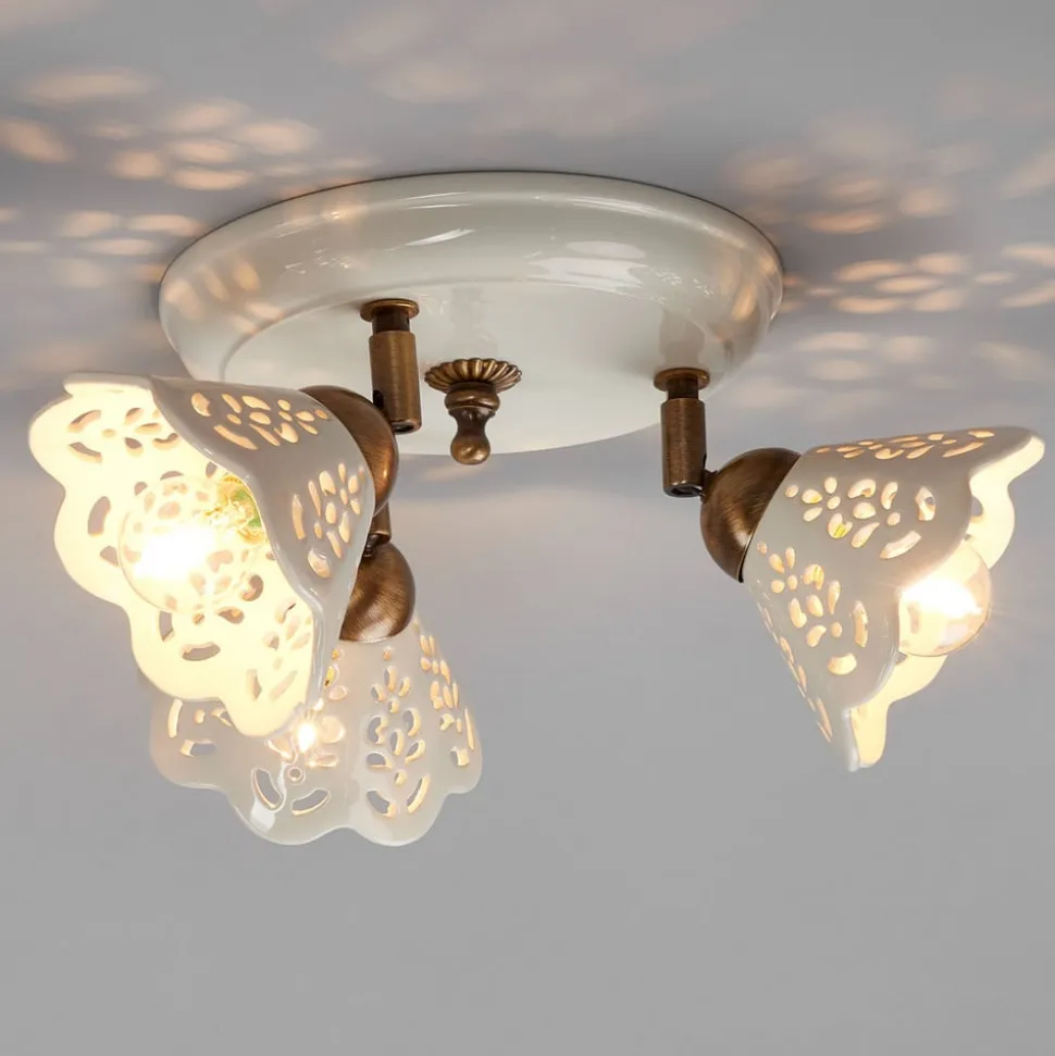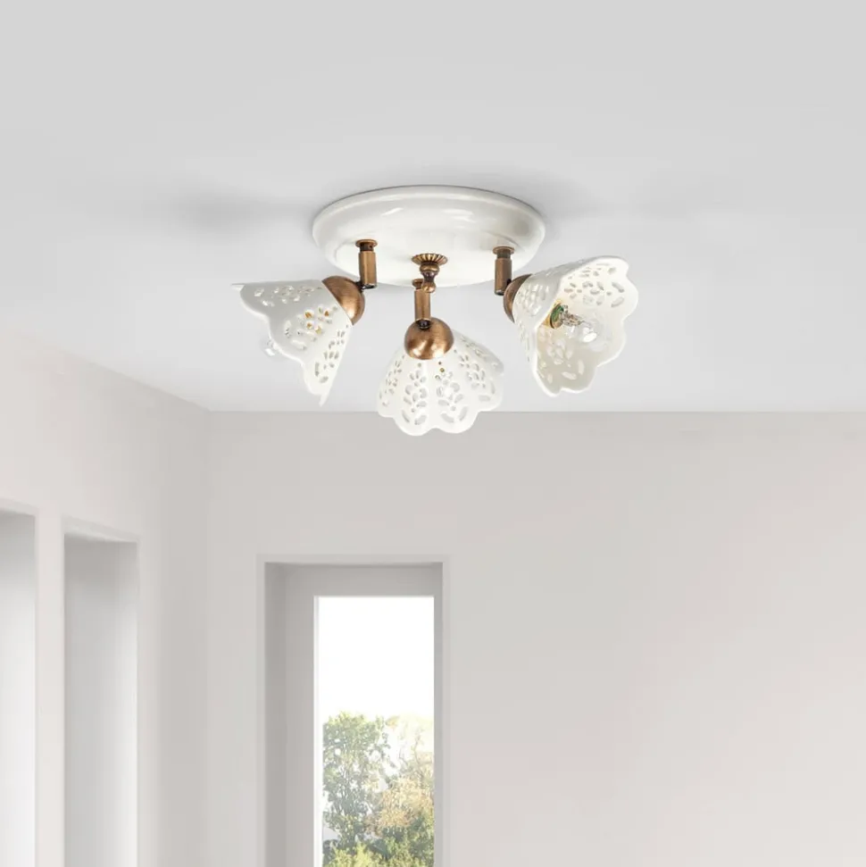 Betoverend ontwerp voor een betoverende plafondlamp – Portico Deze PORTICO plafondlamp heeft 3-lamps en betovert gewoon iedereen met haar romantische landhuisstijl, die perfect kan worden geïntegreerd in verschillende kamers. De witte, geglazuurde keramische kappen maken van de lamp een uniek stuk. Het speciale geperforeerde patroon, dat doet denken aan kant, creëert een romantische flair. Hoge functionaliteit dankzij ergonomisch ontwerp De lamp reflecteert het licht bijzonder goed. Het spot naar beneden en creëert zo een heel speciale touch. De beugels, die gemaakt zijn van metaal, zijn ook ontworpen om bij de stijl te passen en een hoge kwaliteit te garanderen.