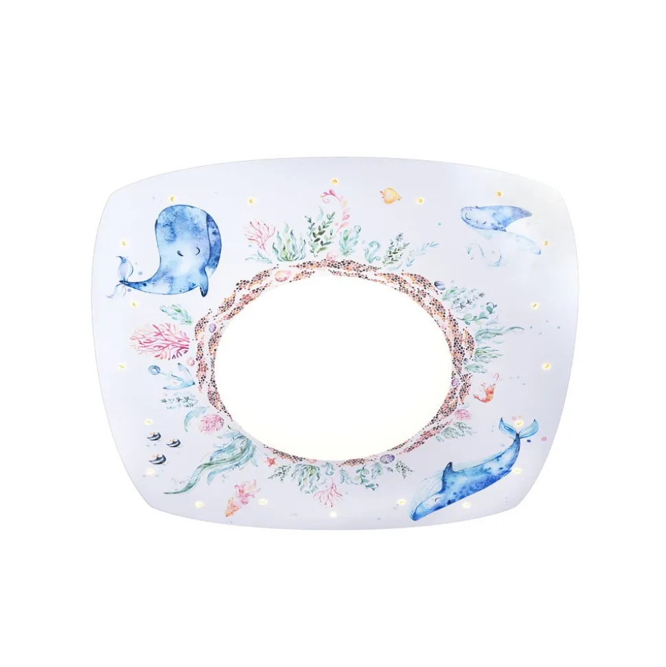 Plafondlamp met zeedieren in een fantasierijk ontwerp Deze plafondlamp is speciaal ontworpen voor kinderkamers en brengt speelse elegantie in de kamer met zijn kleurrijke ontwerp. Met dit verlichtingselement wordt de kinderkamer een plek waar de fascinatie voor licht in elk detail wordt weerspiegeld. Dit lampje kan apart worden geschakeld zodat het nachtlampje apart kan worden ingeschakeld. Het warmwitte hoofdlampje bevindt zich in het midden. De 40 LED’s aan de rand van de lamp kunnen apart worden ingeschakeld als nachtlampje. Schakelen tussen de twee verlichtingsopties en alle lichtbronnen samen schakelen kan eenvoudig met de wandschakelaar – Nachtlampfunctie met 40 lm