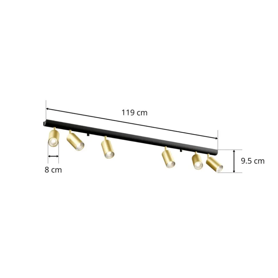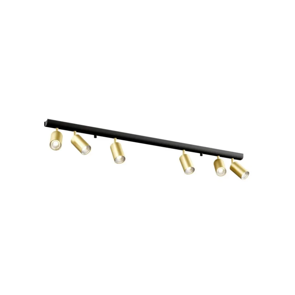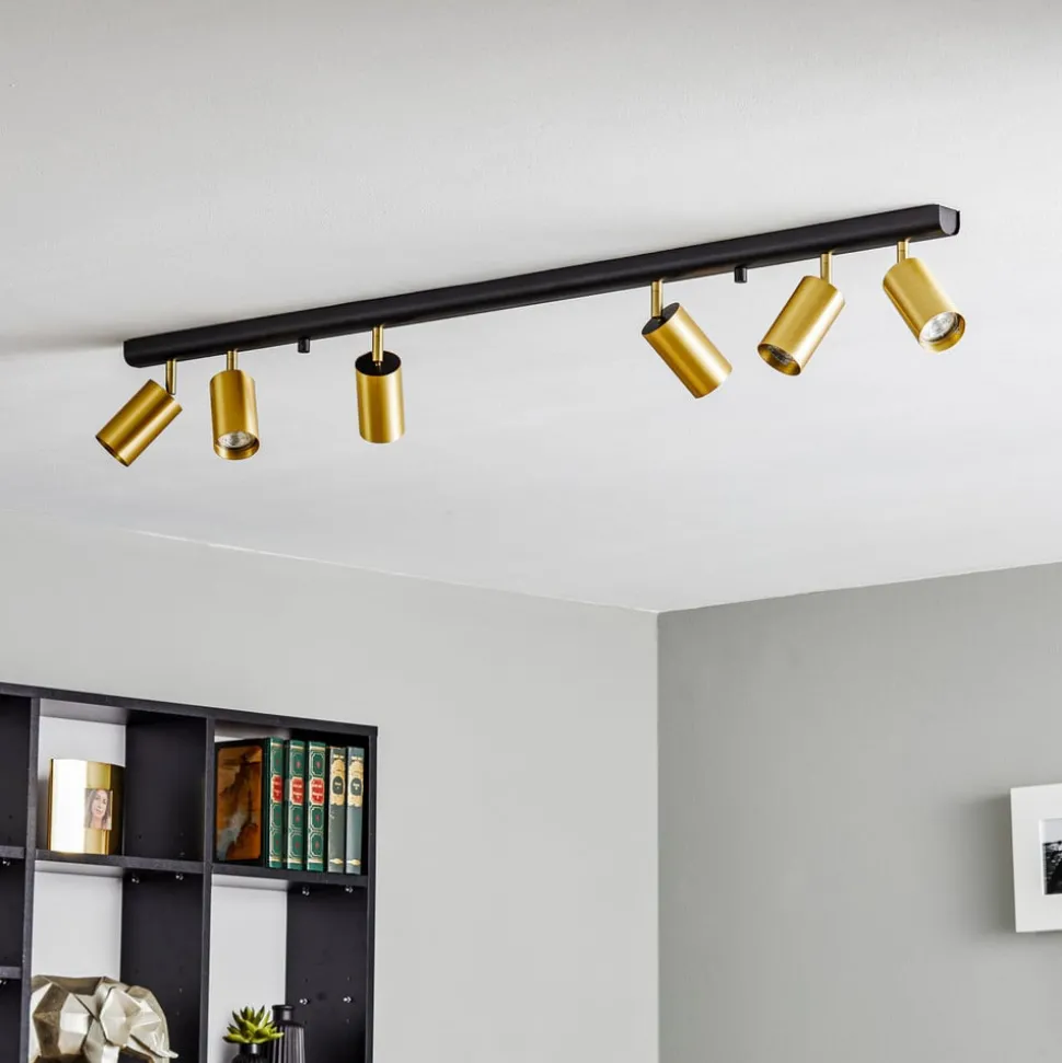 De plafondspot Eye Spot 6-lamps in de kleurencombinatie zwart en mat messing combineert modern design met functionele verlichting. Deze spot is gemaakt van hoogwaardig metaal en past naadloos in verschillende interieurstijlen en zorgt voor stijlvolle accenten in woon- en eetkamers, gangen en keukens. De zes individueel richtbare spots maken een gerichte verlichting mogelijk en creëren zo een aangename sfeer.