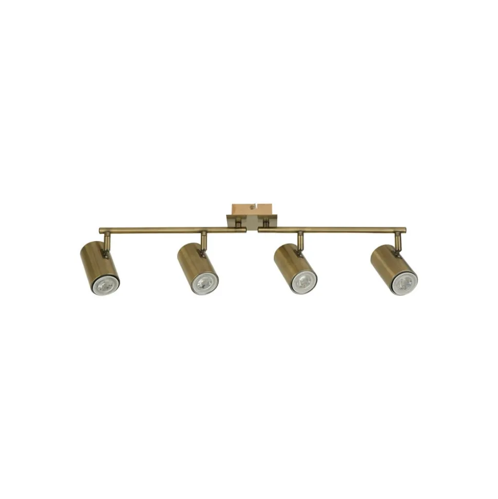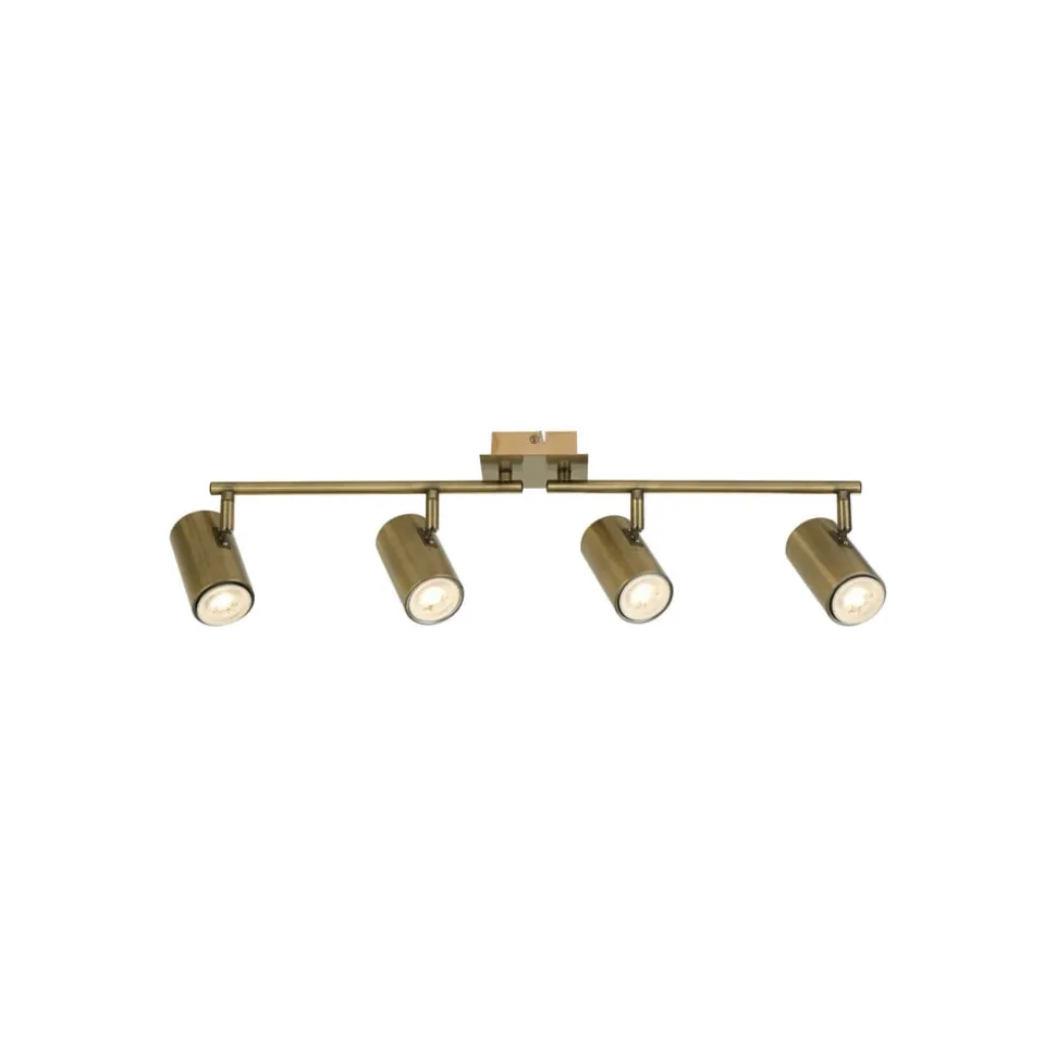 X Meteor plafondspot van staal met vier kantelbare spots Met zijn cilindrische spots van staal met antiek messing look combineert de X Meteor plafondspot vintage charme met moderne functionaliteit. Die biedt de voordelen van veelzijdige verlichting, omdat het ontwerp het mogelijk maakt om verschillende gebieden of objecten tegelijk te verlichten. Elk van de vier kappen kan gekanteld en individueel aangepast worden om het licht te richten waar het nodig is. Voor vier vrij selecteerbare GU10 lampen (niet inbegrepen, zie accessoires).