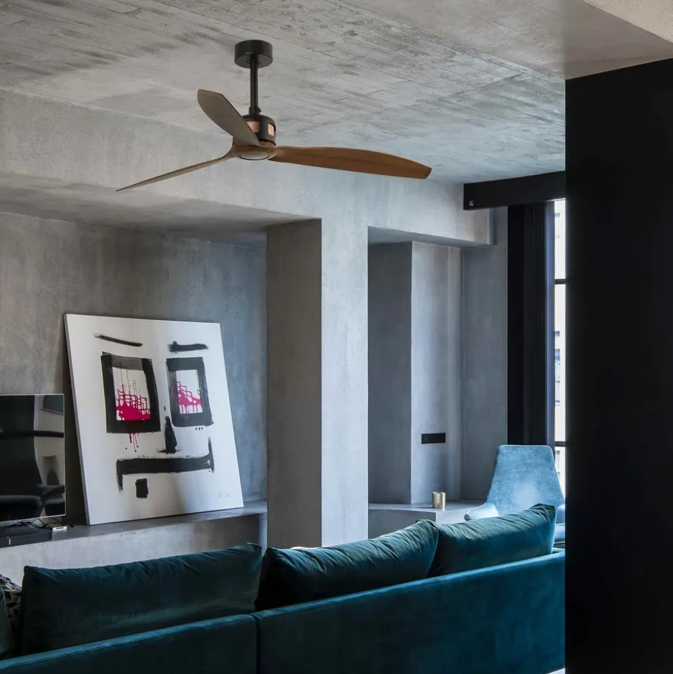 Met de meegeleverde afstandsbediening kunt u niet alleen de ventilator in- en uitschakelen, maar ook zes snelheidsstanden selecteren en de draairichting wijzigen. Dit laatste maakt de plafondventilator niet alleen in de zomer tot een nuttig element in uw interieur; ook in de winter overtuigt Copper door de warme lucht die zich onder het plafond ophoopt terug te voeren naar de ruimte, waardoor de verwarming wordt ondersteund.