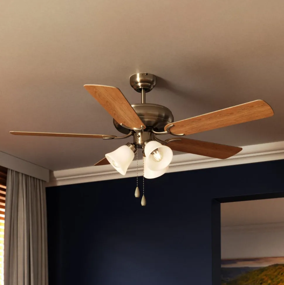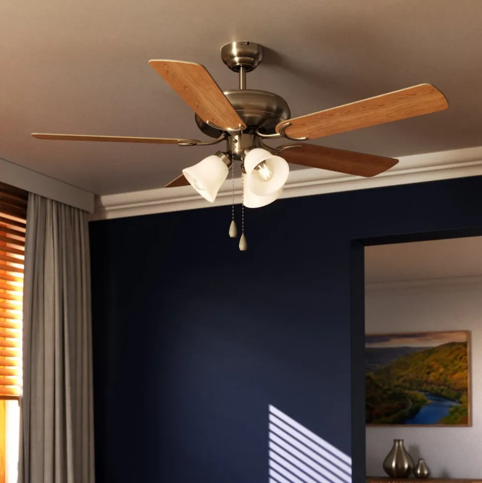 Plafondventilator Las Palmas met drie lampen en omkeerbare bladen De plafondventilator Las Palmas is uitgerust met drie prachtige glazen lampenkappen, die elk kunnen worden voorzien van een E27 lamp tot 40 W. De motorbehuizing met kap is gemaakt van metaal. De motorbehuizing met baldakijn is gemaakt van metaal, de bladen zijn gemaakt van gelamineerd hout en hebben verschillend ontworpen zijkanten. Het uiterlijk van de ventilator kan worden veranderd door de bladen te draaien. De twee trekkettingen op de ventilator kunnen worden gebruikt om het licht aan en uit te doen en om de ventilator op 3 verschillende snelheidsniveaus in te stellen. Het is ook mogelijk om te schakelen tussen zomer- en winterwerking. Dankzij de omkeerbare draairichting (zomer- en winterstand) kan de ventilator het hele jaar door worden gebruikt en zorgt hij voor een aangenaam ruimteklimaat. Met een diameter van 132 cm is de plafondventilator ideaal voor kamers met een grootte van 20-27 vierkante meter. Hij kan ook worden geïnstalleerd op schuine plafonds met een hoek tot 13°. De benodigde lampen E27 worden niet meegeleverd. Technische gegevens: – Motorvermogen 62 W – Geluidsniveau 54,4 dB – Hellingshoek van de bladen 11°