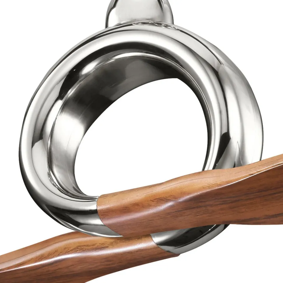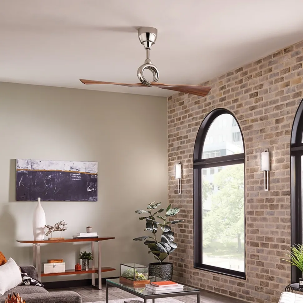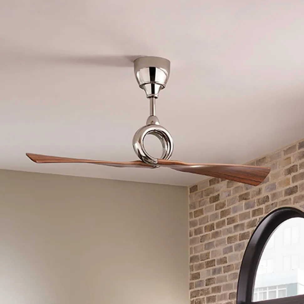 De tweevleugelige plafondventilator Link lijkt met zijn twee vleugels van ABS-kunststof, die uit een stalen ring komen, uit één stuk te zijn gegoten. Het optische contrast tussen gepolijst nikkel en donkere walnoottint is bijzonder decoratief. Een afstandsbediening wordt meegeleverd.