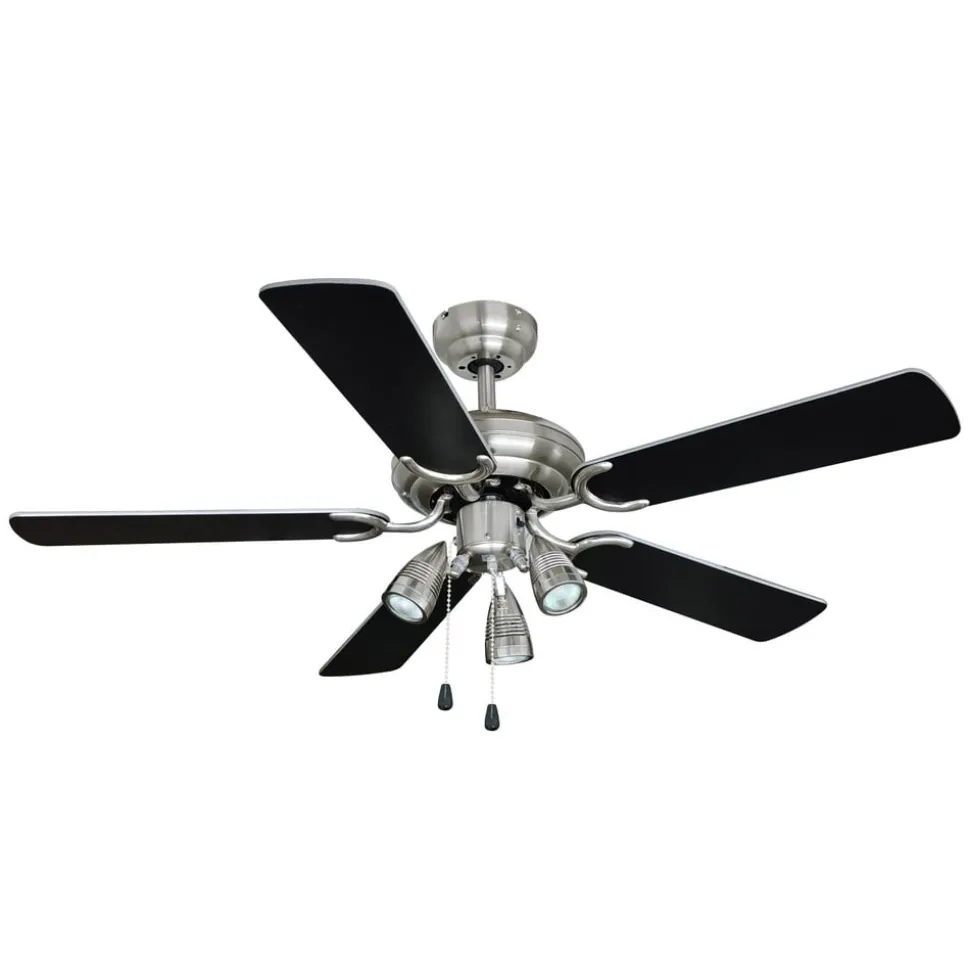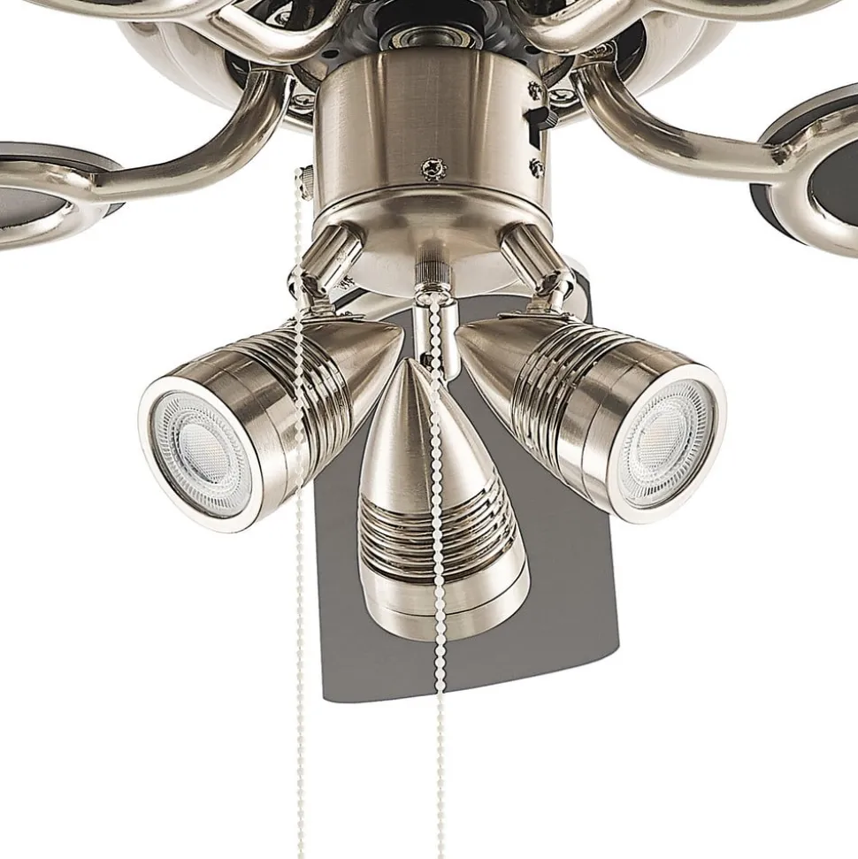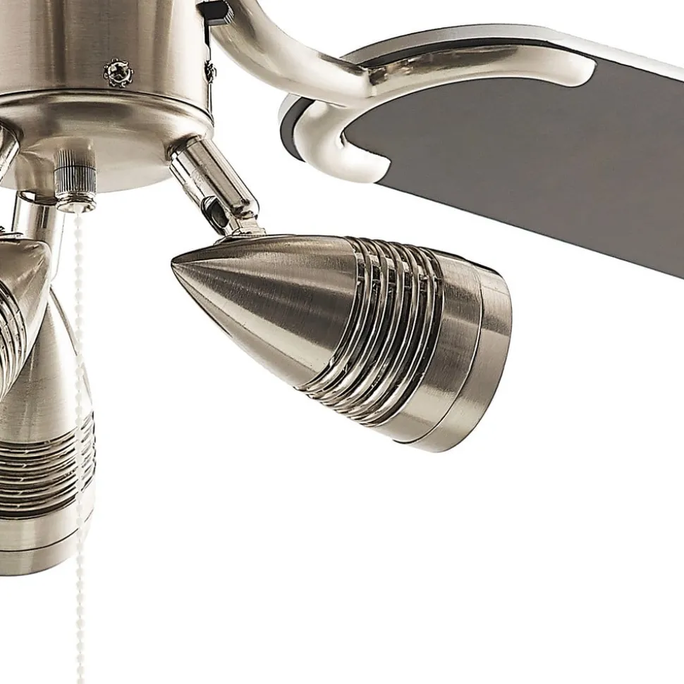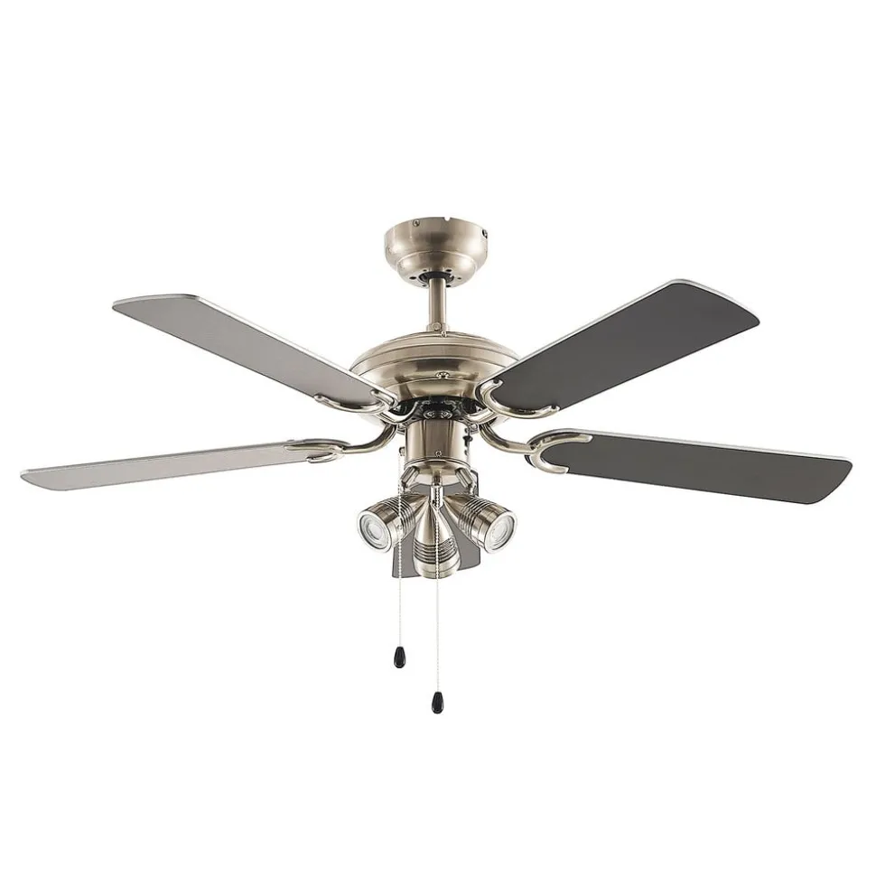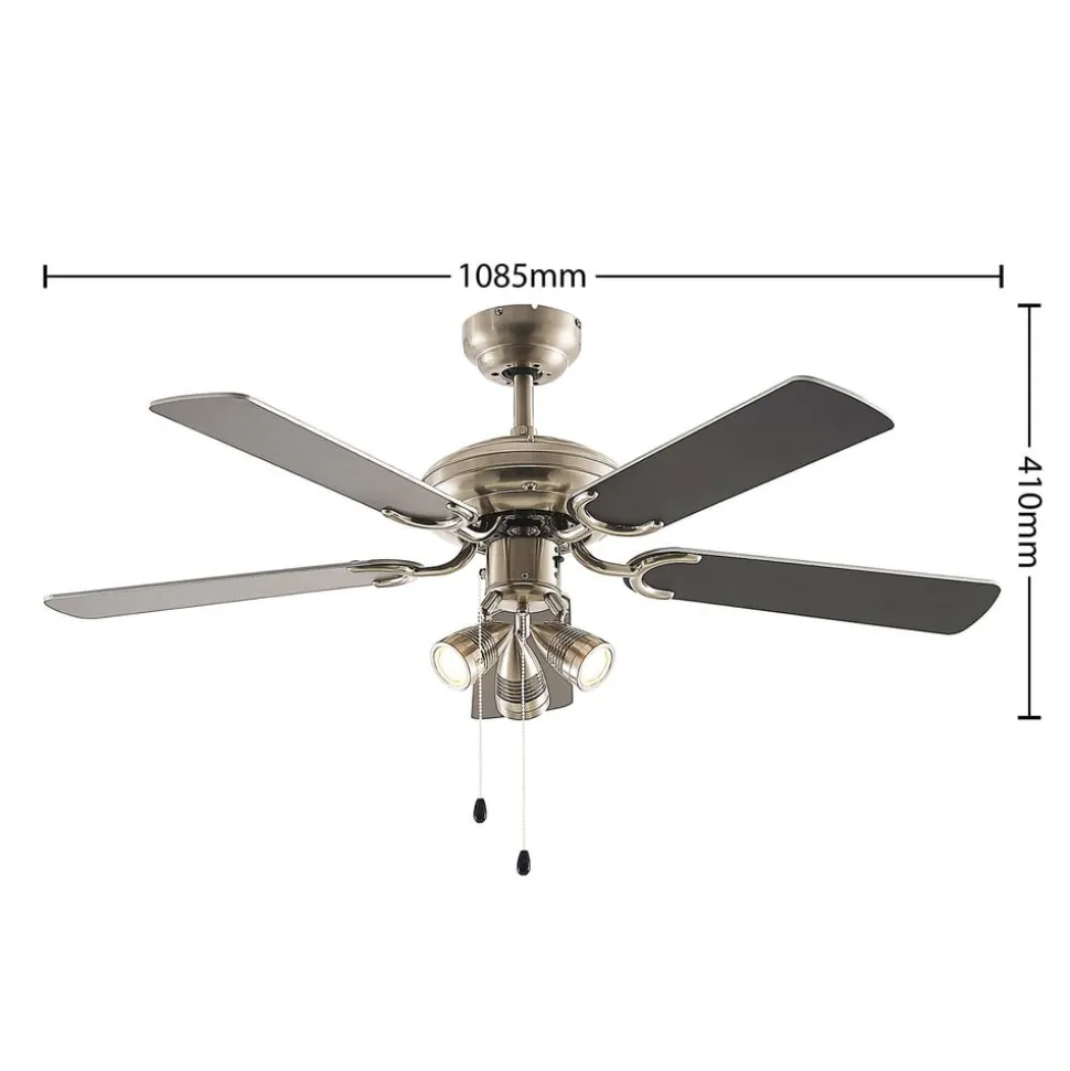 Tijdloze plafondventilator Anariki van staal en hout in een opvallend kleurcontrast Anariki heeft vijf bladen die rond een zilverkleurig lichaam draaien, dat is uitgerust met drie fittingen voor bijbehorende lampen. Het zwart met zilveren kleurenschema zorgt voor een aantrekkelijk contrast en rondt het ontwerp af. Functies De ventilator en het licht worden bediend met twee trekschakelaars. Daarnaast kun je van vooruit naar achteruit schakelen door op de schakelaar op de behuizing van de Anariki plafondventilator te drukken. Technische gegevens Motorsnelheid: 180/130/80 tpm Motorvermogen: 40/27/20 watt Luchtcirculatie: 58,8/33,75/19 m³/min Ventilator Geluidsvermogen: 43,5/40/38 dB