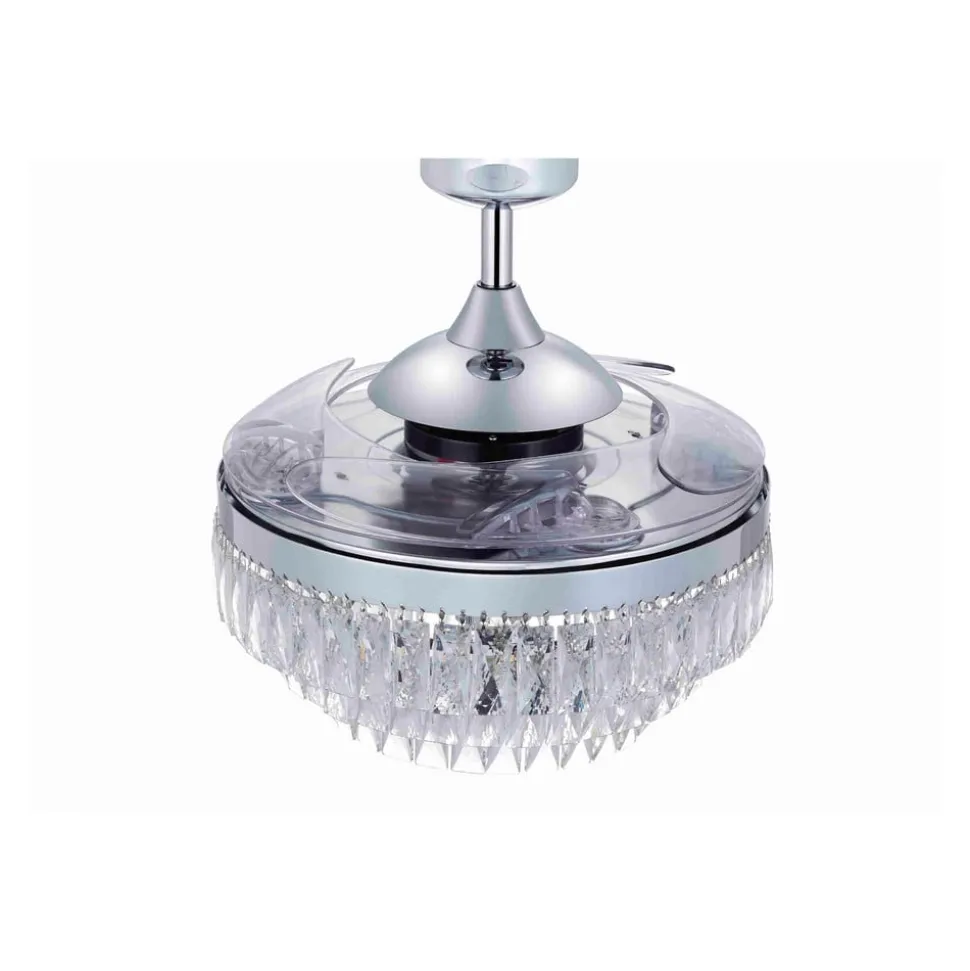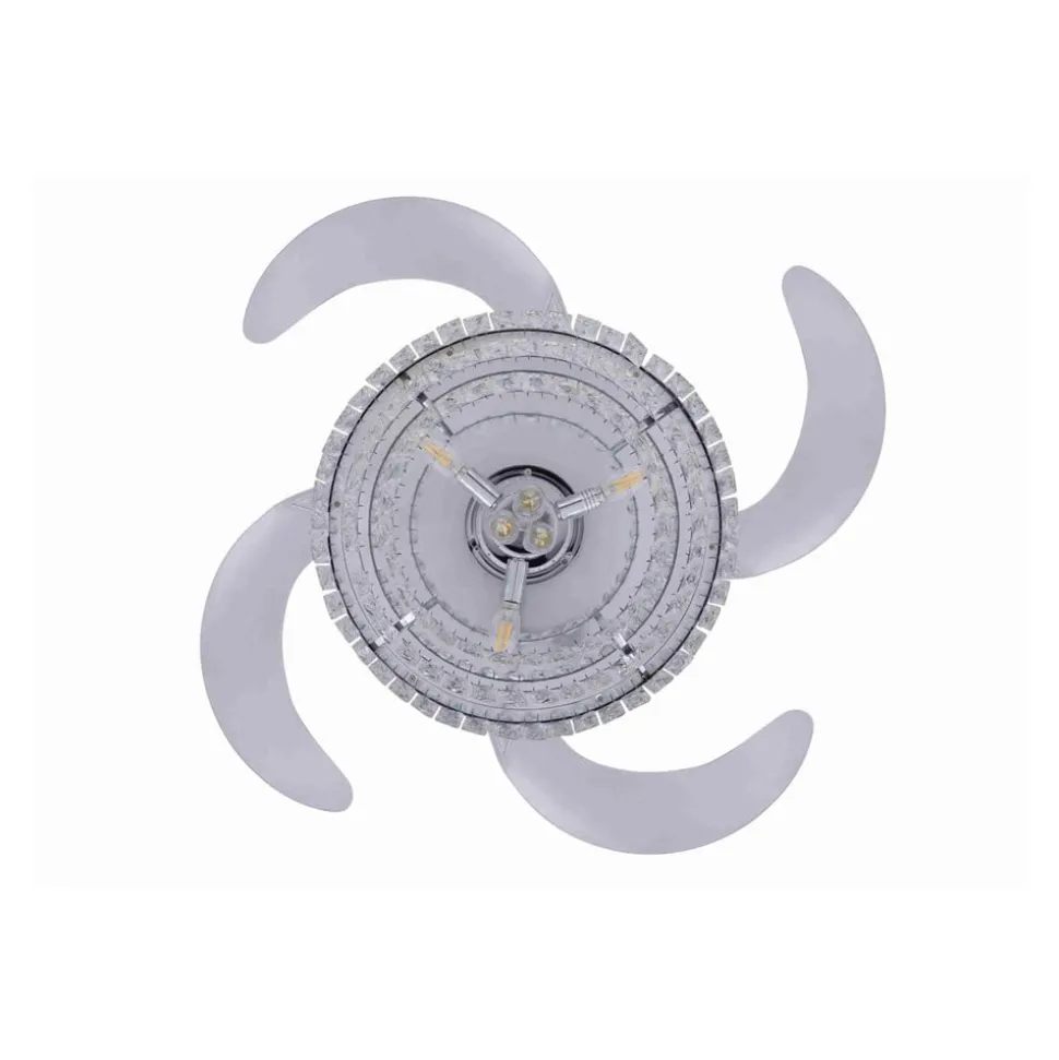 In kristallook – verlichte plafondventilator Fanaway Veil met vier uitschuifbare bladen en afstandsbediening Fanaway Veil biedt een elegante combinatie van klassieke plafondlamp en ventilator in kristal. De vier acrylschoepen worden alleen uitgeschoven in de ventilatormodus; wanneer ze puur als plafondlamp worden gebruikt, verdwijnen ze boven de behuizing. De vier meegeleverde warmwitte E14 LED kaarslampen met gloeilampoptiek zijn boven een kristallook hanglamp geplaatst, die voor een sprankelende lichtervaring zorgt. In de zomer zorgt Fanaway Veil voor een koel briesje. In de winter ondersteunt de omkeerbare looprichting de verwarmingsfunctie. Ook geschikt voor verlaagde plafonds. Functies: Fanaway Veil is uitgerust met een AC-motor die drie snelheidsniveaus en een omkeerbare draairichting mogelijk maakt (instelbaar op de behuizing). Geschikte lampen worden meegeleverd. De ventilator- en verlichtingsfuncties worden bediend met de bijgeleverde afstandsbediening. Technische gegevens: – Motorsnelheid: 255/195/141 tpm – Motorvermogen: max. 56 W – Luchtcirculatie: max. 180 m³/min Opmerking: De bijgeleverde afstandsbediening werkt op twee AAA-batterijen (niet meegeleverd).