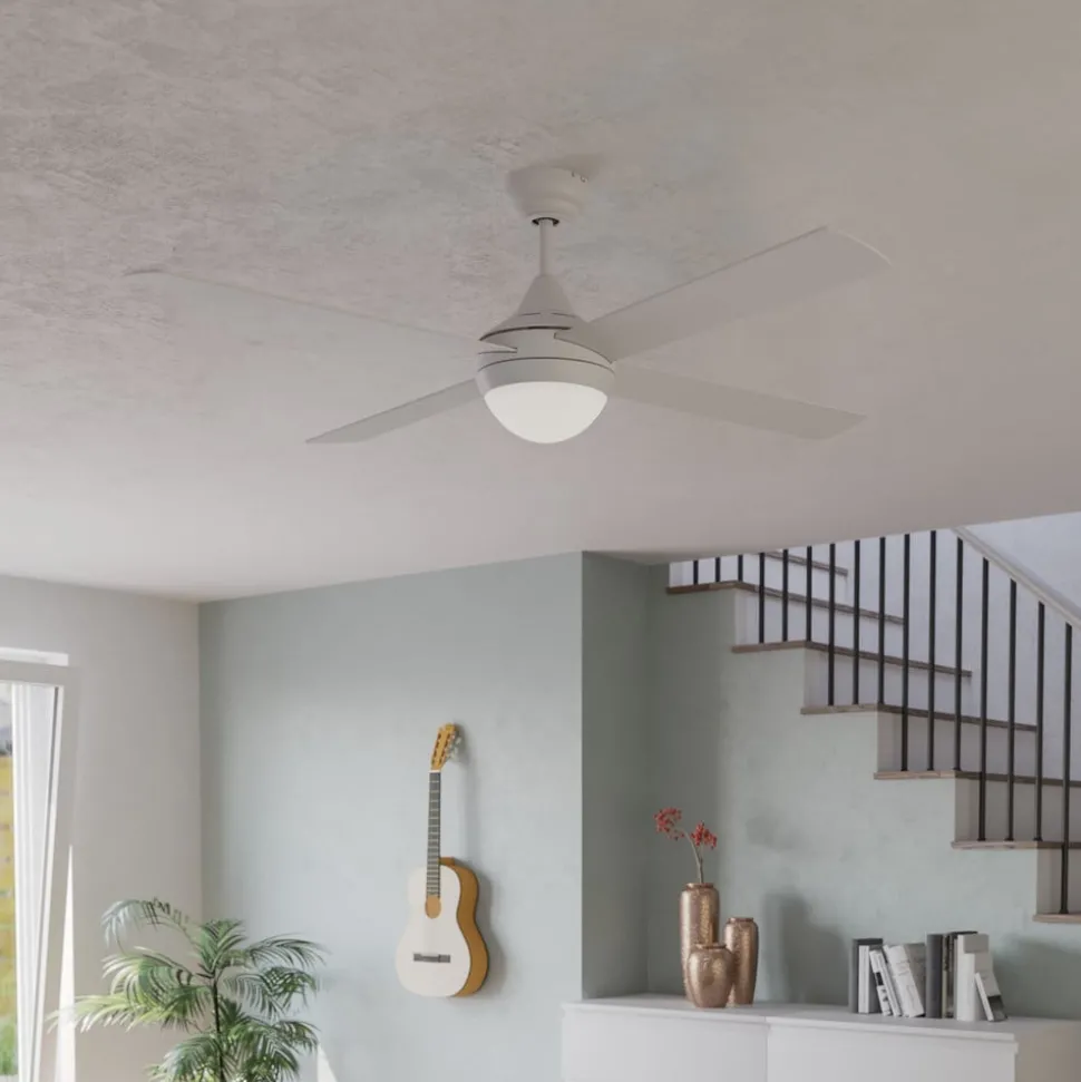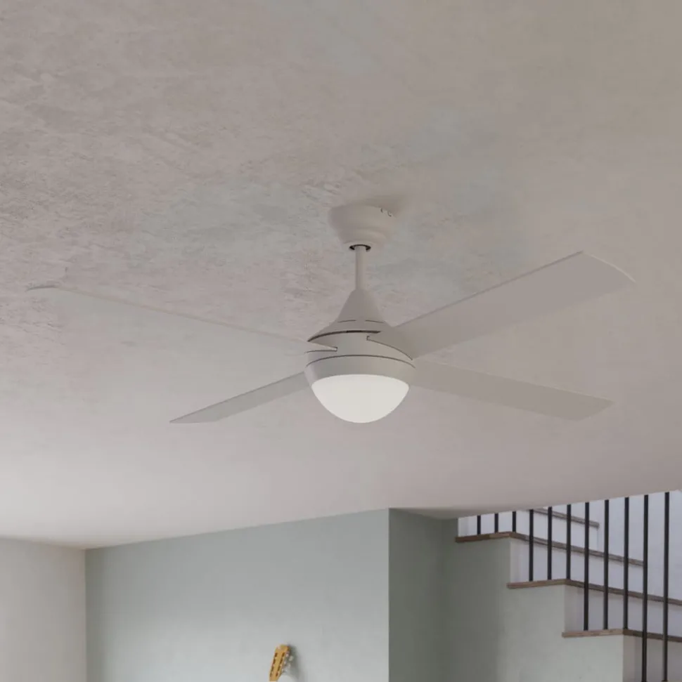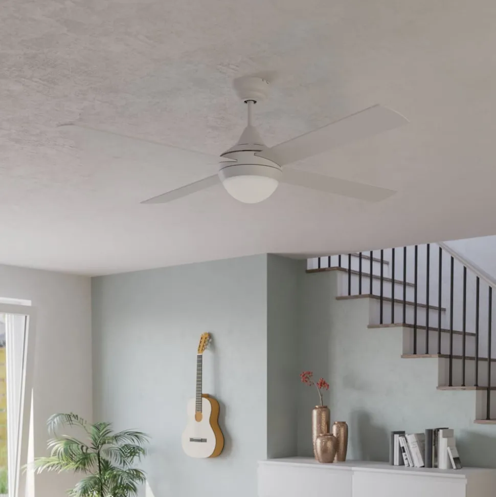 Plafondventilator Varadero met licht en afstandsbediening Varadero is een plafondventilator met vier bladen en een geïntegreerd licht met fitting E27. De behuizing is gemaakt van metaal, de bladen zijn gemaakt van MDF met twee verschillend gekleurde zijden en kunnen worden gedraaid om het uiterlijk te veranderen. Het licht kan worden in- en uitgeschakeld met de meegeleverde afstandsbediening, er kunnen 3 verschillende snelheidsniveaus worden geselecteerd en verschillende timerfuncties worden ingesteld. Het is ook mogelijk om te schakelen tussen zomer- en wintermodus. Dankzij de omkeerbare draairichting (zomer- en winterwerking) kan de ventilator het hele jaar door worden gebruikt en zorgt hij voor een aangenaam ruimteklimaat in de zomer en een gelijkmatige verdeling van warme lucht in de winter – Geschikt voor ruimten met een grootte van 20-27 vierkante meter – Kan worden gemonteerd op plafonds met een hellingshoek tot 13° – Geleverd zonder lamp Technische gegevens: – AC-motor, motorvermogen 55 W – Geluidsniveau 52 dB – Hellingshoek van de bladen 10°