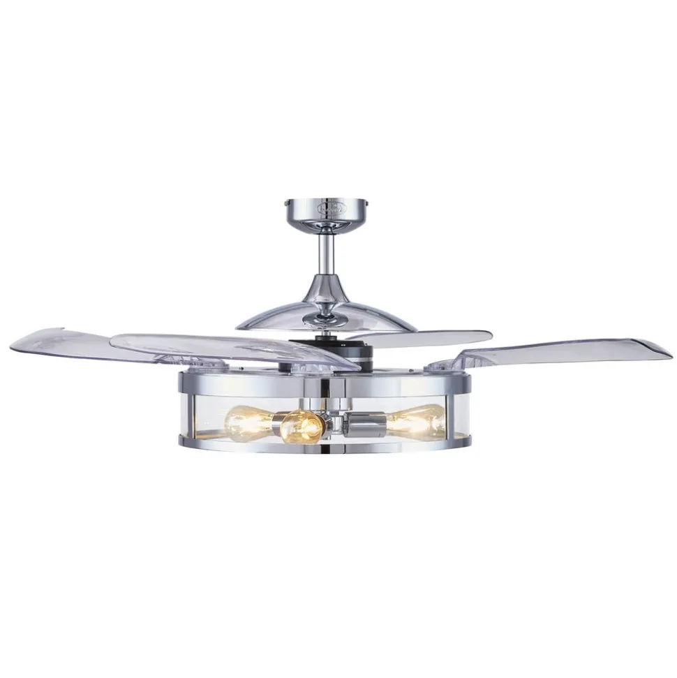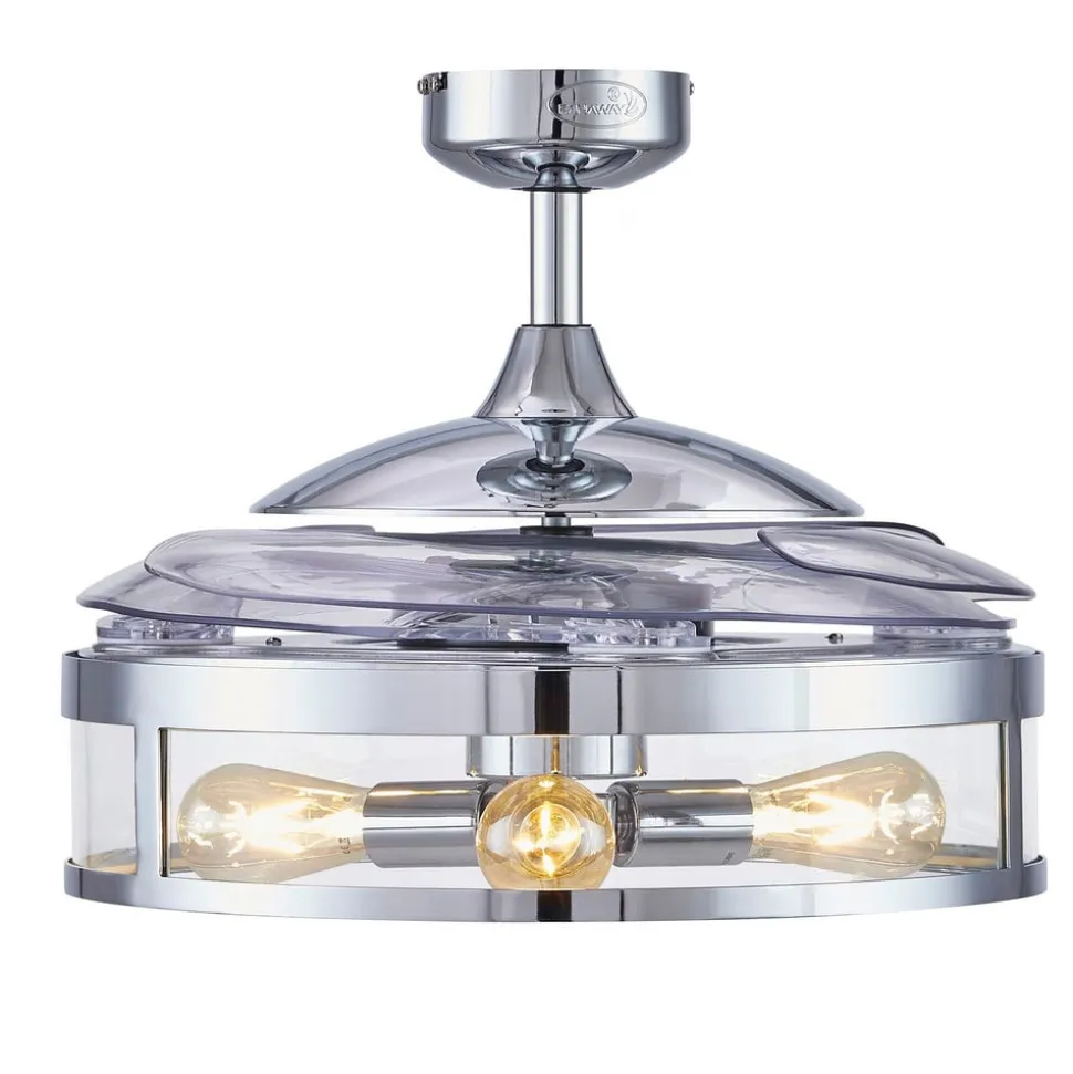 Ombouwbare plafondventilator Fanaway Classic met verchroomde behuizing en heldere schoepen Als ventilator, als eenvoudige plafondlamp of als beide tegelijk – Fanaway Classic is een praktisch interieurelement. De afwerking en de fitting met drie LED rustiek lampen ST64 in gloeilampoptiek maken de plafondventilator tot een blikvanger. Functies Met drie snelheidsstanden kan de luchtcirculatie worden aangepast aan de omstandigheden in de kamer. De plafondventilator belooft zowel verkoeling in de zomer als besparingen op de verwarmingskosten in de winter, omdat de omgekeerde draairichting de verwarmde lucht die onder het plafond gevangen zit, terugvoert naar de bezette ruimte. De plafondventilator Fanaway Classic wordt bediend met de meegeleverde afstandsbediening (vereist 2 x AAA-batterijen – zie accessoires).
