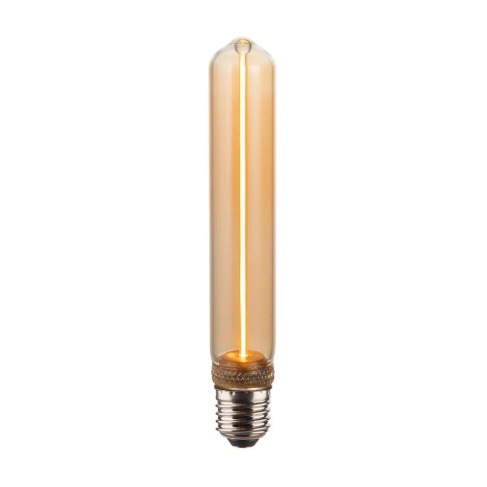 Dimbare E27 buislamp Edge met 2 W, 1.800 K, amber Deze LED-lichtbron in T30-formaat is ideaal voor decoratieve toepassingen. Ze is uitgerust met een amberkleurig getint glazen lampje met een futuristisch ogende, rechte lichtgeleider binnenin. Het extra warmwit licht kan indien nodig worden gedimd.
