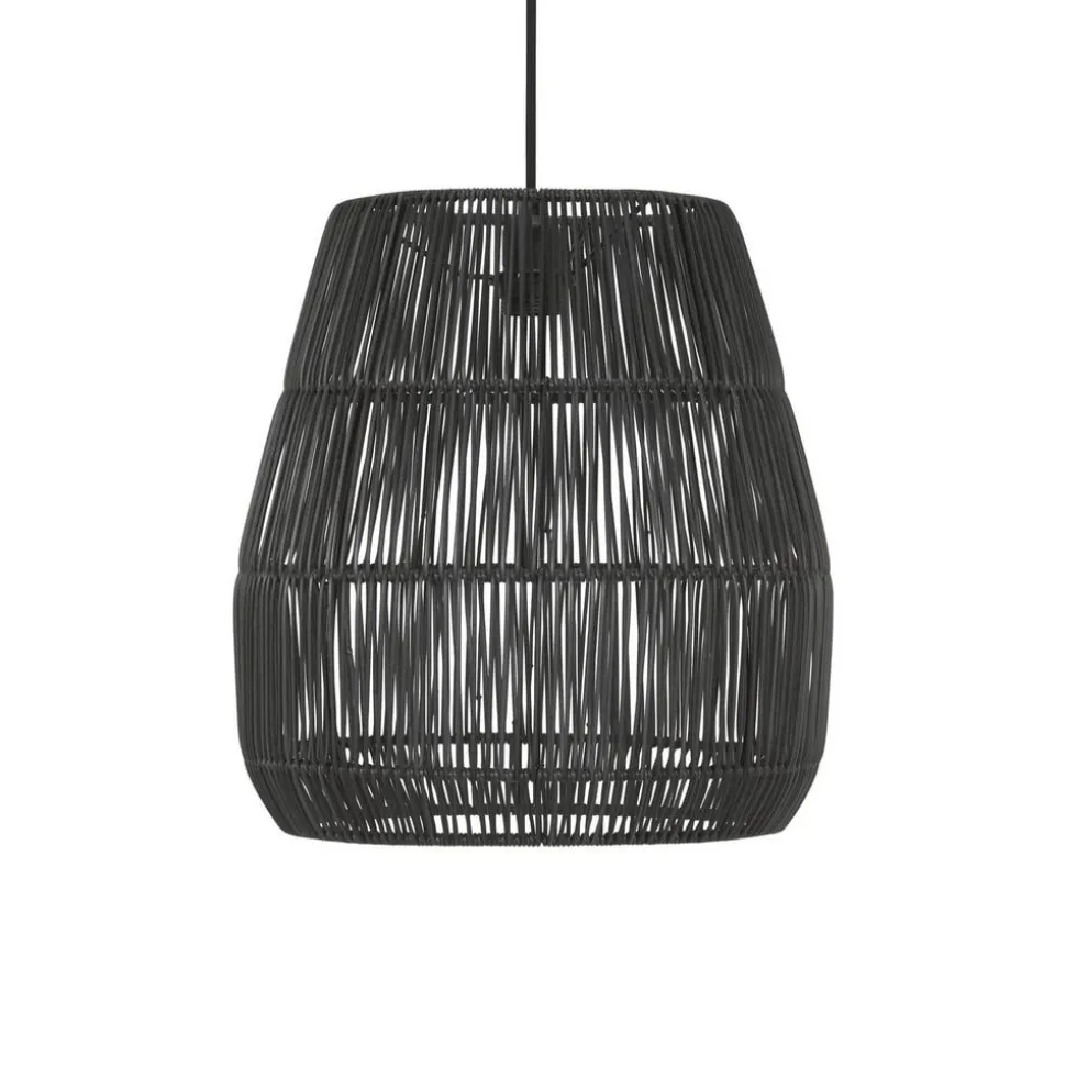 Stijlvolle Saigon buiten hanglamp met IP44 bescherming Saigon is een hanglamp gemaakt van polyrattan. Polyrattan is een duurzaam materiaal dat bestand is tegen weer en wind. De geweven structuur zorgt voor een prachtig licht. De kap wordt verkocht met een zwarte kabelset