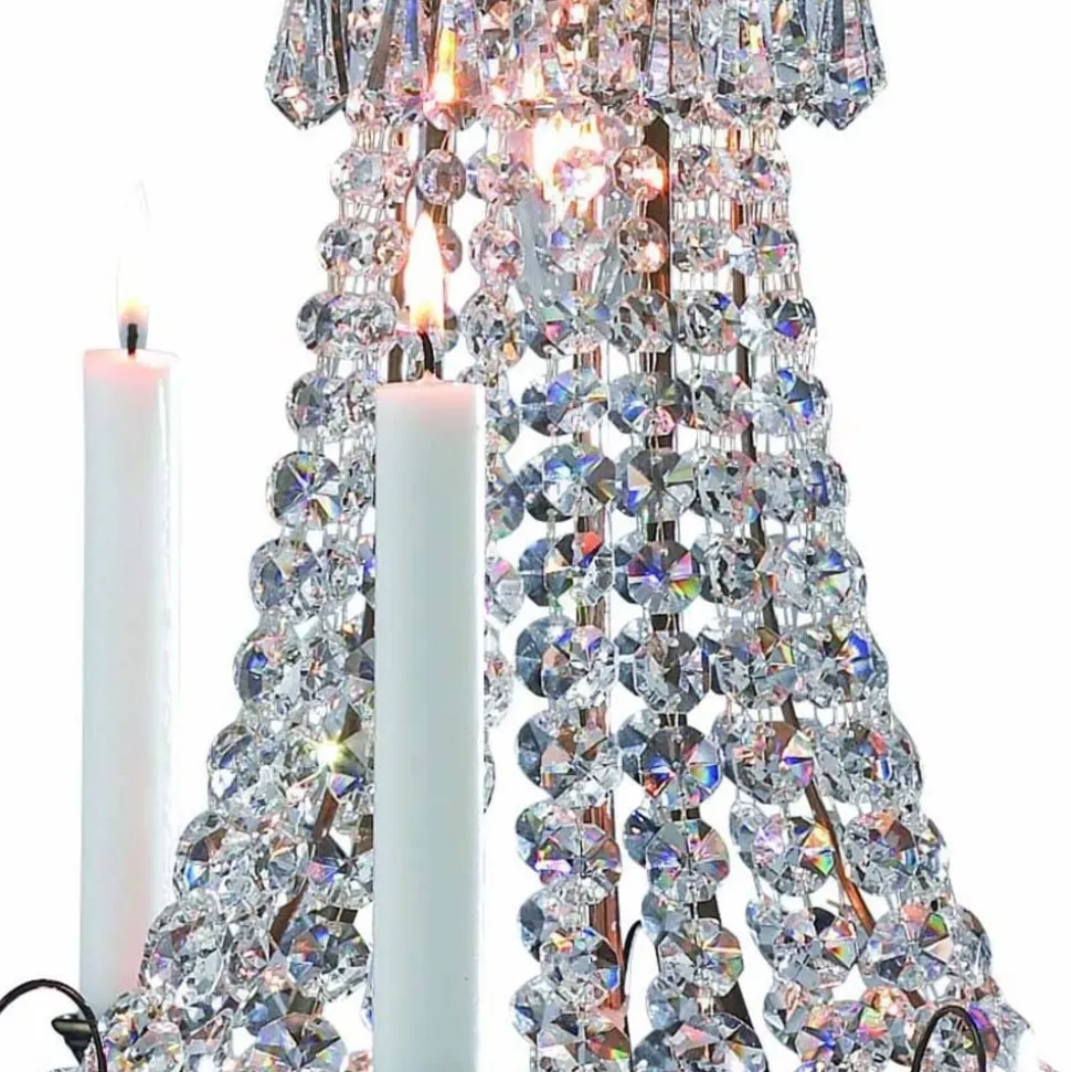 Deze kaarsenkroonluchter is een waar pronkstuk. De lamp verkrijgt haar klassieke design door het metalen frame, dat in verschillende maten verkrijgbaar is. De talloze kristallen geven de kaarsenkroonluchter iets extra’s en zorgen bovendien voor schitterende lichteffecten. De imposante verschijning wordt afgerond door kandelaars, waarin slanke kaarsen voor een harmonieus evenwicht zorgen. Ook uitgeschakeld is deze kroonluchter een prachtige blikvanger en zorgt deze voor een betoverende sfeer in elke ruimte.