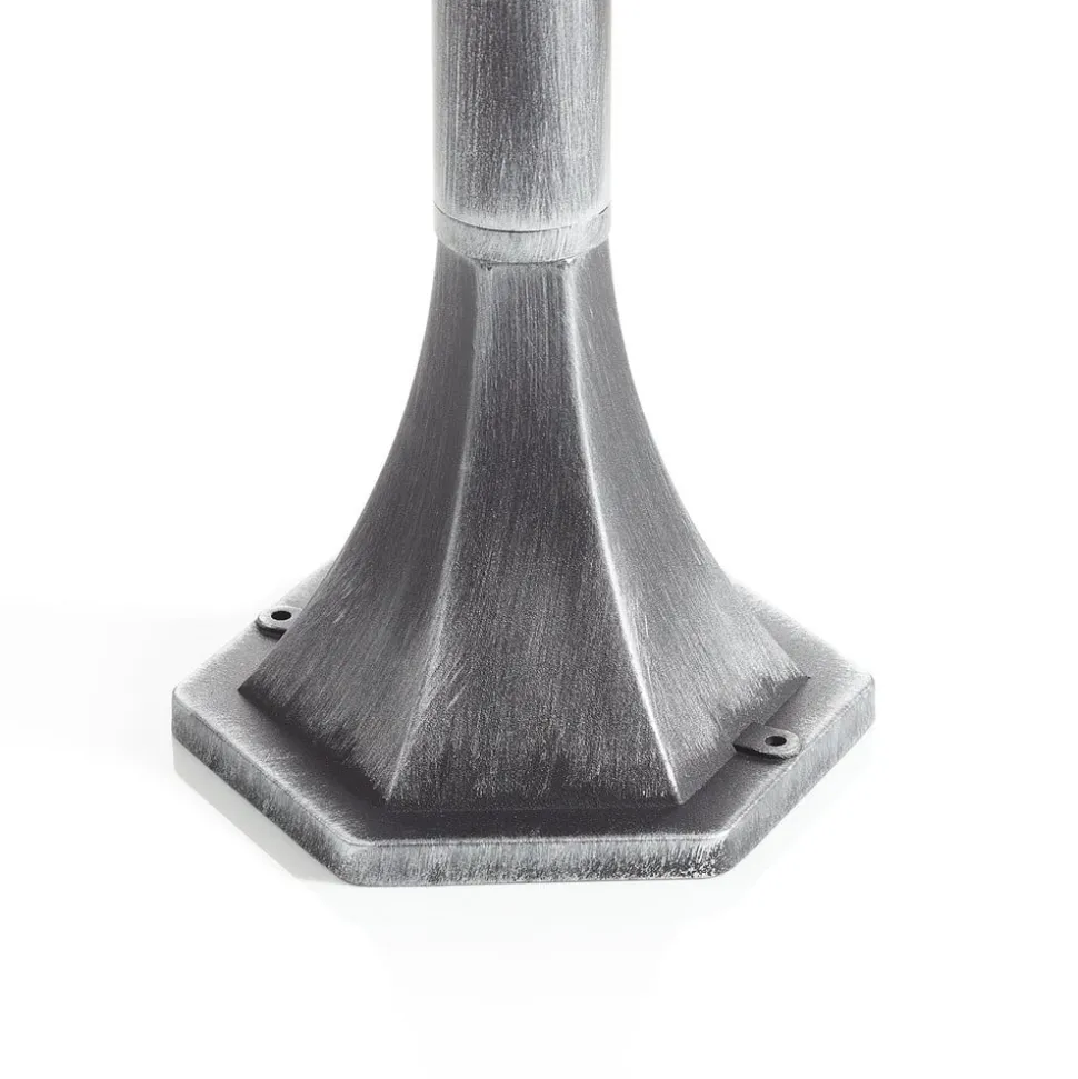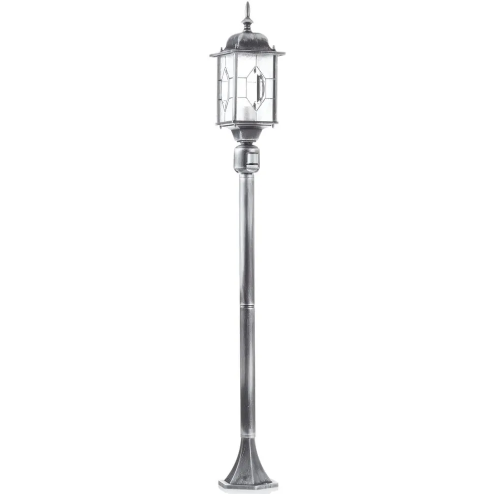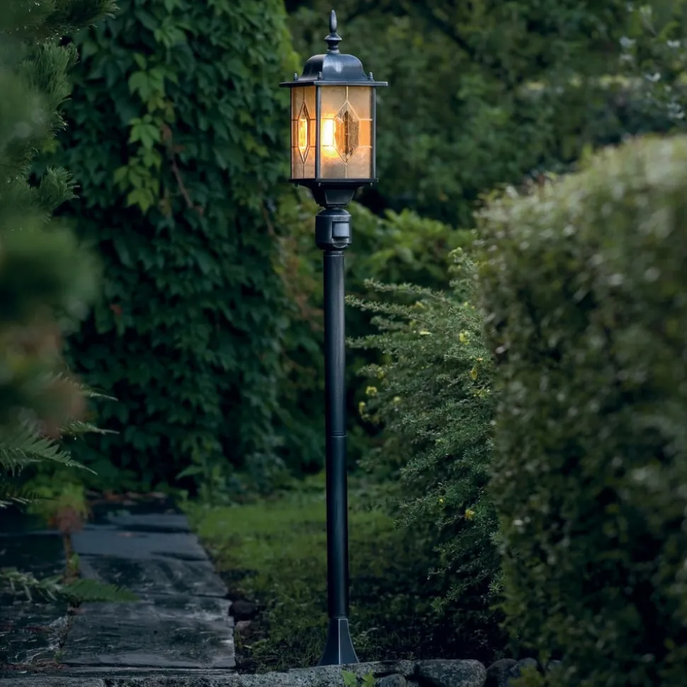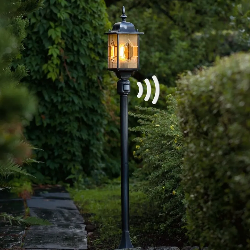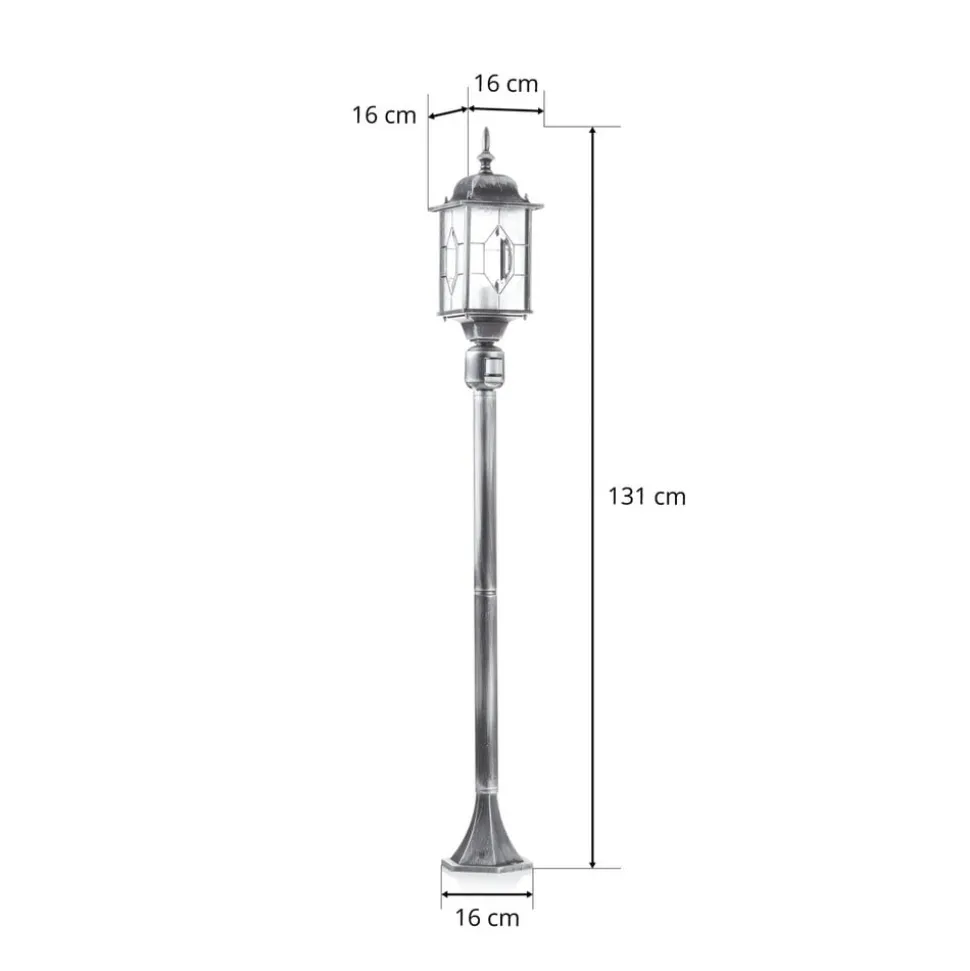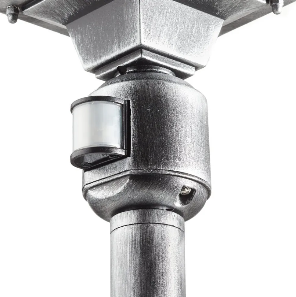 De padlamp MILANO van aluminium met rechtop staande lamp in lantaarnvorm ziet er zeer sfeervol uit dankzij het acrylglas in loodkristaldecor en de versieringen aan paal en lamp. De lantaarn zorgt dankzij het heldere glas voor een goede verlichting. De padlamp is uitgerust met een bewegingsmelder. De uitschakelvertraging kan van ca. 5 seconden tot 8 min. worden ingesteld. Bij een registratiehoek van 180° bedraagt de reikwijdte 8 m.