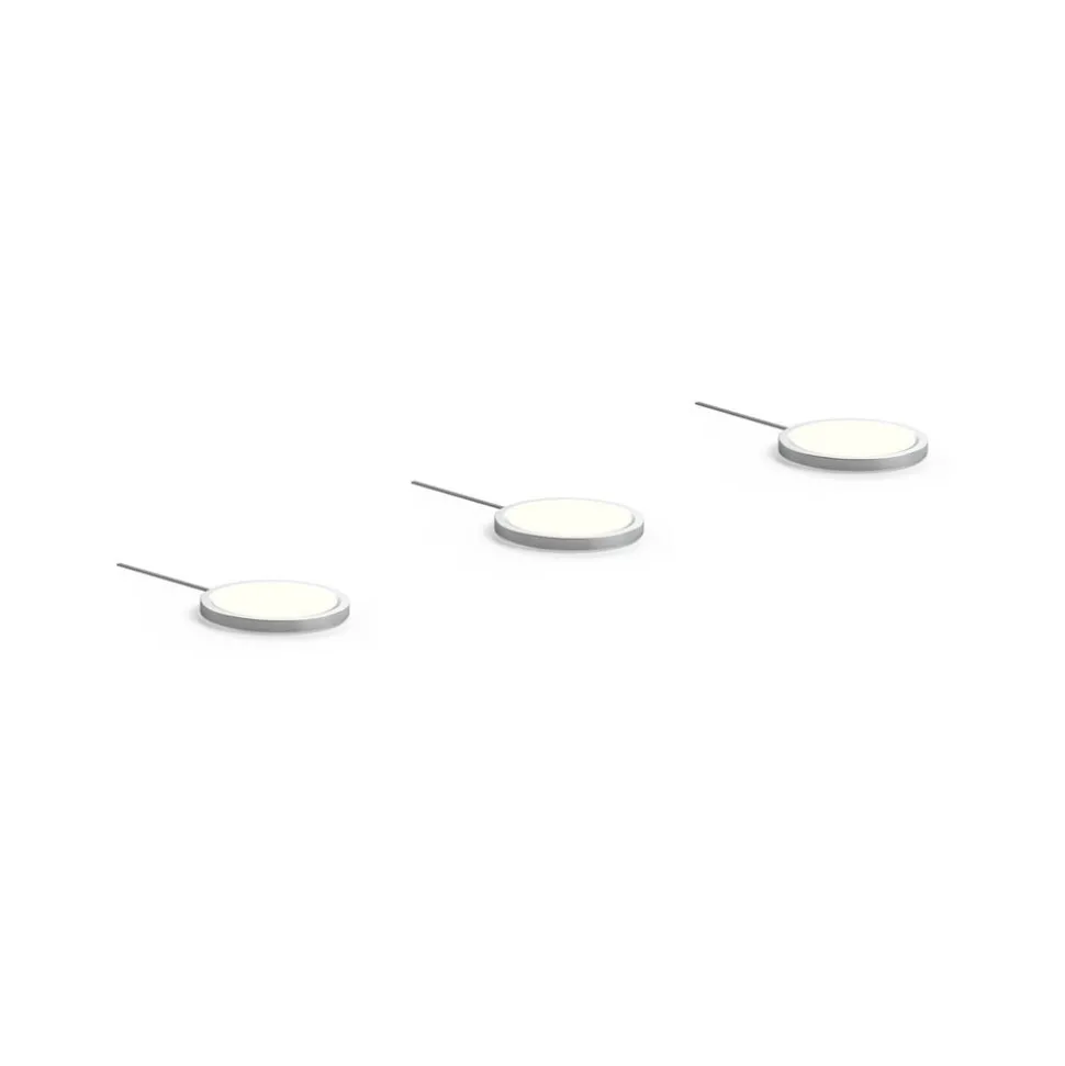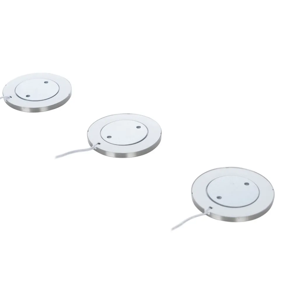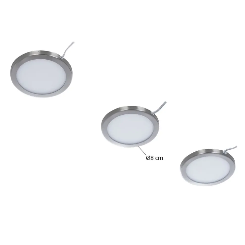 Ronde LED-onderkastarmatuur Jopos in een set van drie, dimbaarDeze set onderkastarmaturen biedt praktische diensten in de woonkamer en keuken. De afzonderlijke lampen zijn rond en zitten in een frame met een satijnnikkelafwerking. Ze kunnen niet alleen worden in- en uitgeschakeld, maar ook in drie stappen worden gedimd (15% – 50% – 100%).