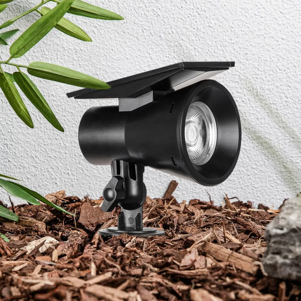 Kleine LED-zonnestraler Jostiras in zwart Jostiras is een praktische toevoeging aan tuinen en andere buitenruimtes. De spot heeft een grondspies en een zonnepaneel zodat er geen externe voeding nodig is voor de werking. Als de batterij volledig is opgeladen, kan Jostiras tot 16 uur lang schijnen. Omdat de spot specifiek gericht kan worden, is het mogelijk om bepaalde objecten direct te verlichten en zo de scène mooi in scène te zetten. De lamp op zonne-energie kan ook worden gebruikt om eenvoudig paden te verlichten, waarbij het effect natuurlijk bijzonder goed is als er meerdere lampen op een rij worden geplaatst.