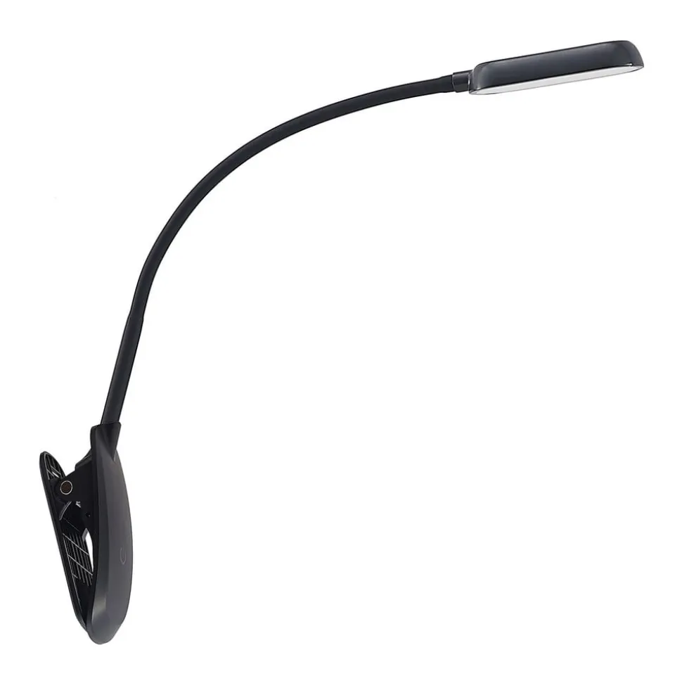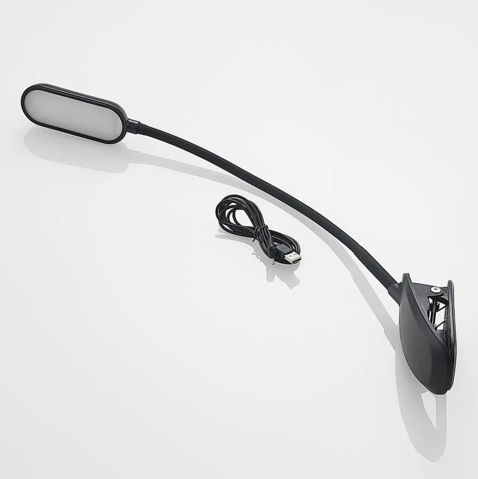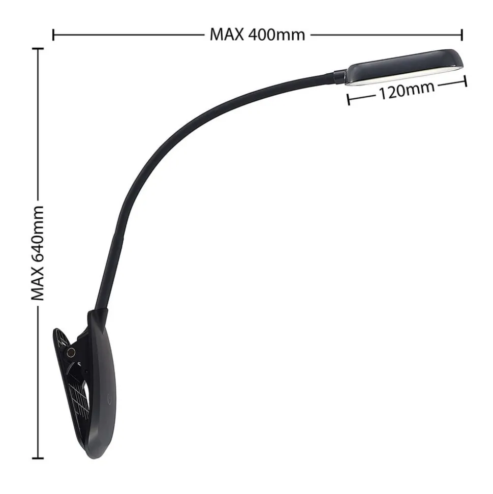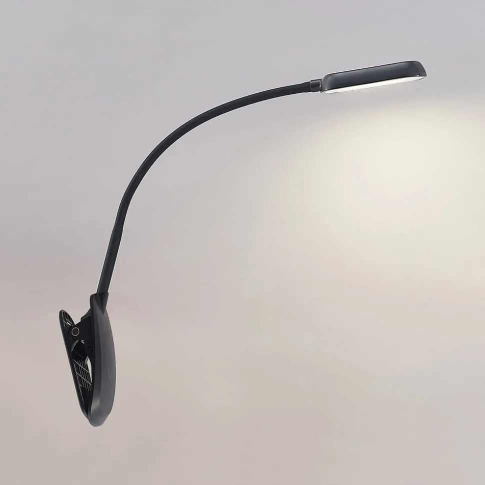Traploos dimbare LED klemlamp Najari in zwart design, met USB-aansluiting en oplaadbare batterij De LED klemlamp Najari heeft een zwart design. Het heeft een slanke lampenarm die flexibel kan worden geplaatst en een ovale lampenkop. De permanent geïnstalleerde LED’s zijn helder en zuinig in gebruik. Indien gewenst kan de helderheid van het armatuur worden aangepast aan de eigen behoeften door middel van traploos dimmen. De klembreedte van 5 cm is voldoende om deze lamp stevig aan een tafel, bed of ander meubilair te bevestigen en zo precies daar licht te geven waar het nodig is. De batterij wordt opgeladen via een USB-aansluiting.