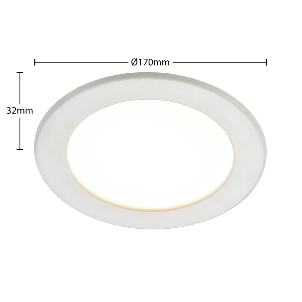 Cadance ronde LED inbouwlamp in wit, instelbare lichtkleur, IP44 De LED inbouwlamp Cadance heeft een bijzondere rijkdom aan functies, want ze kan meer dan alleen verlichten, maar ziet er met haar ronde vorm en witte oppervlak buitengewoon discreet uit. De inbouwlamp kan daarom op verschillende manieren worden gebruikt, zowel in privévertrekken als in een commerciële omgeving. Met zijn hogere beschermingsgraad is Cadance goed beschermd tegen vocht en kan daarom ook worden gebruikt in badkamers en andere vochtige ruimtes. Met een DIP-schakelaar op de behuizing kan de lichtkleur naar wens worden geselecteerd vóór installatie. De LED’s kunnen op elk moment extern worden gedimd, op voorwaarde dat er een geschikte dimmer (niet inbegrepen) is geïnstalleerd. Hierdoor kan de verlichting worden aangepast aan de specifieke situatie ter plaatse. Installatiediameter: – Variant 1 (11,5 cm): 10-11 cm – Variant 2 (17 cm): 15-16 cm – Variant 3 (22 cm): 20-21 cm – Variant 4 (24 cm): 22-23 cm