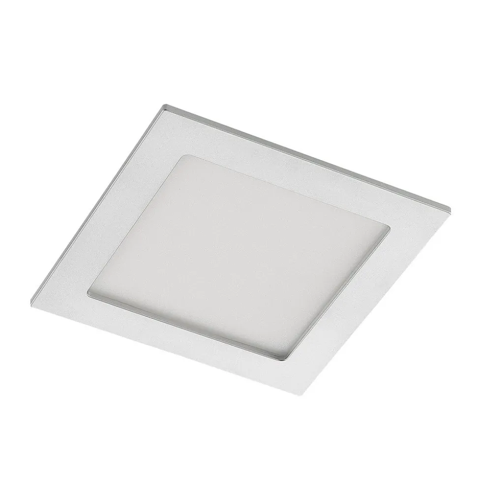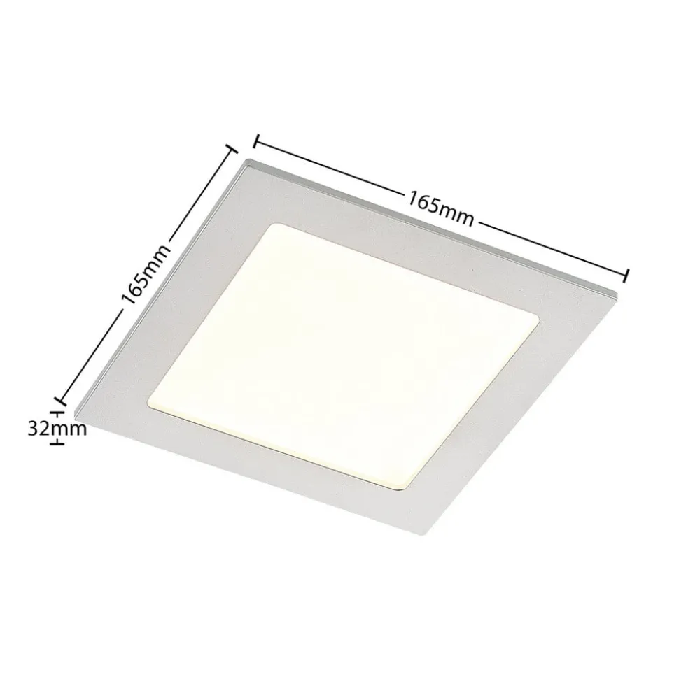 Zilveren LED inbouwspot Helina in hoekige vorm, IP44, dimbaar, lichtkleur instelbaar Helina heeft een vierkante basisvorm en is ontworpen voor installatie in het plafond. Het ontwerp met het hoekige, zilveren frame heeft een aangenaam eenvoudige en tijdloze uitstraling, waardoor het armatuur op verschillende manieren kan worden gebruikt, ook in een commerciële omgeving. De behuizing is gemaakt van robuust polycarbonaat en het feit dat Helina dankzij de beschermingsgraad IP44 ook in vochtige ruimtes kan worden gebruikt, vergroot het aantal mogelijke toepassingen. Een ander pluspunt is dat de lichtkleur ook naar wens kan worden ingesteld; hiervoor is er een DIP-schakelaar op de behuizing om de lichttemperatuur te selecteren voordat de installatie plaatsvindt. Dimbaarheid is ook gegarandeerd als er een externe dimmer beschikbaar is – DIP-schakelaar om de lichtkleur vooraf in te stellen – IP44 voor badkamers en vochtige ruimtes – Robuuste behuizing van polycarbonaat en aluminium clips voor eenvoudige installatie – Extern dimmen