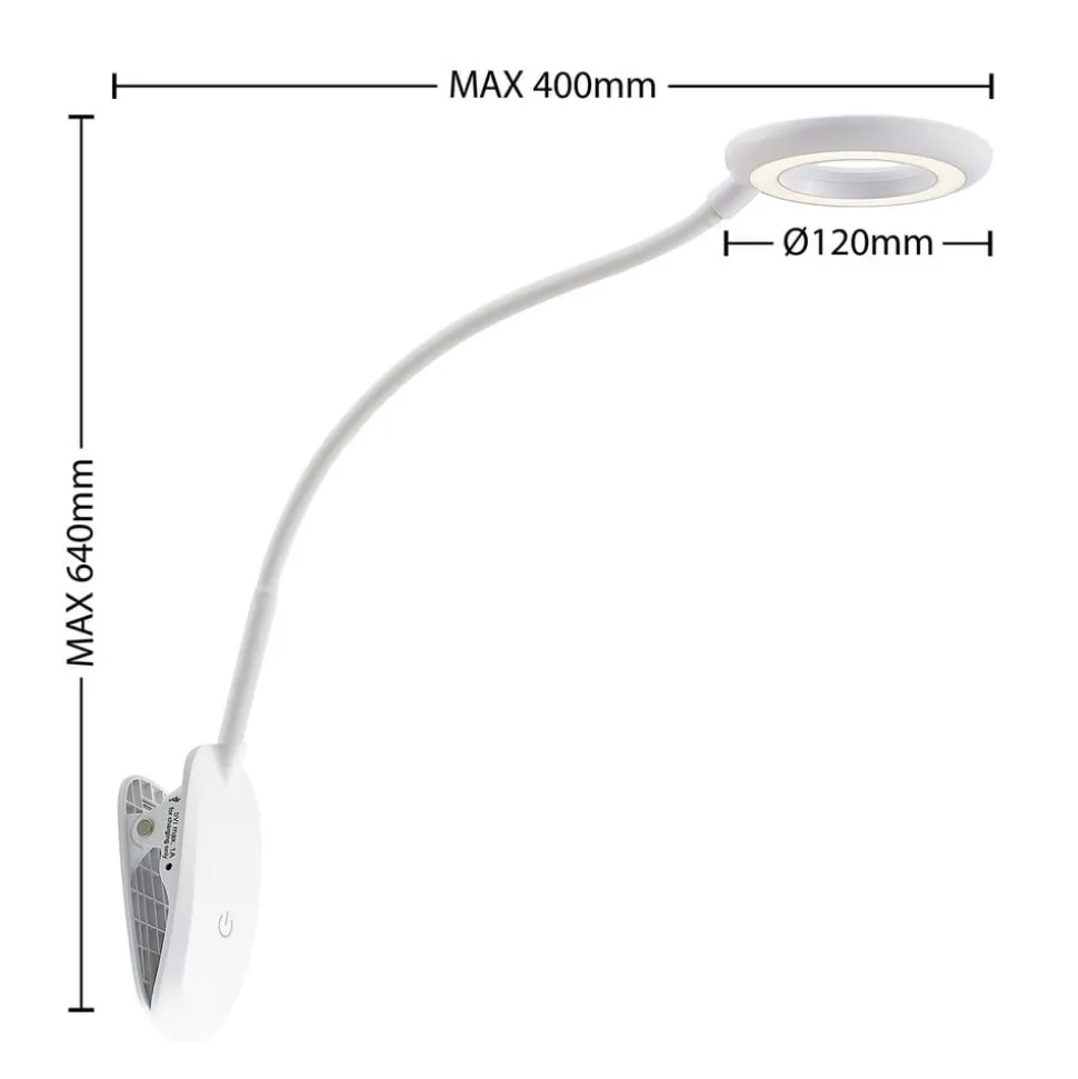 Prios LED klemlamp Harumi, wit, oplaadbare batterij, USB, 51 cm hoog
