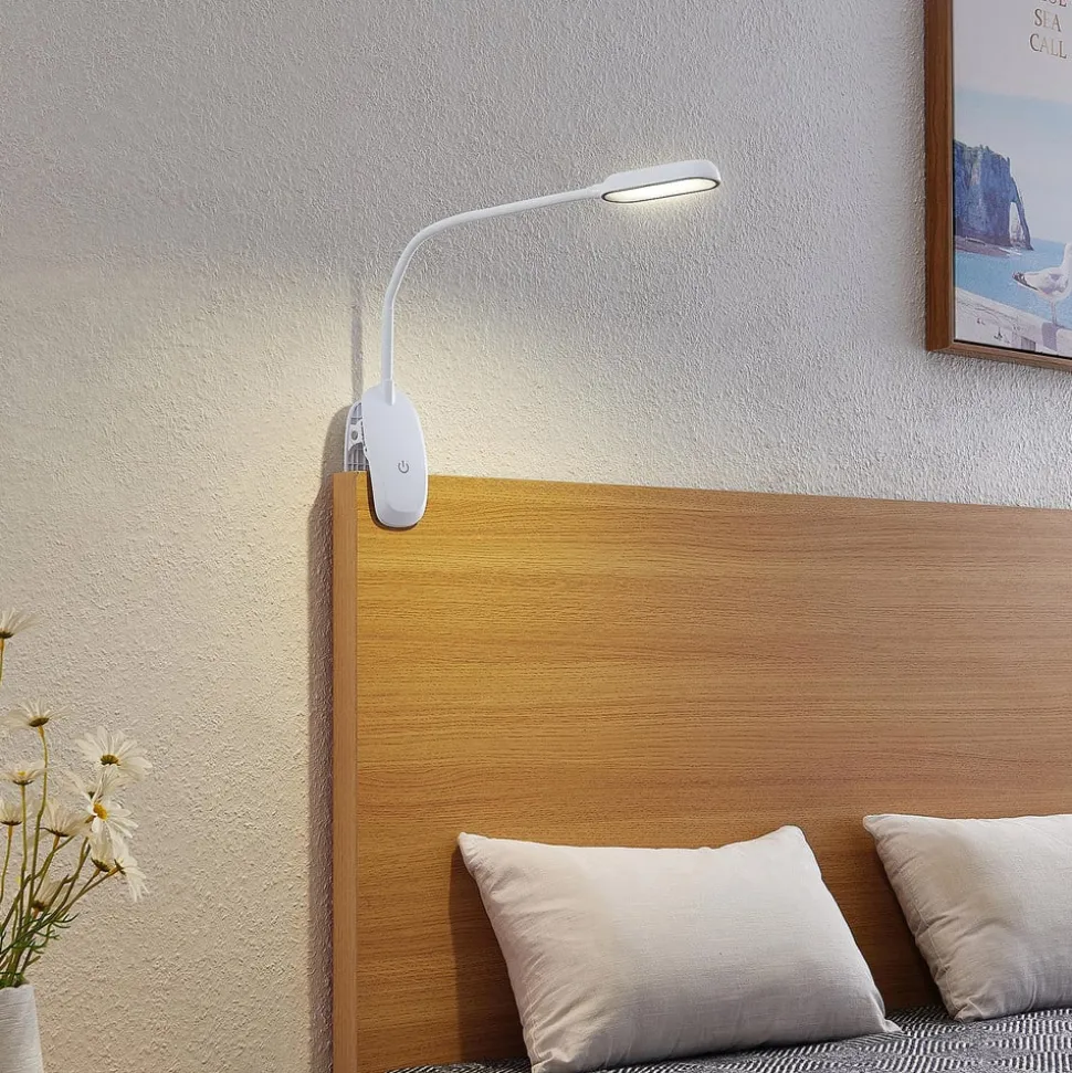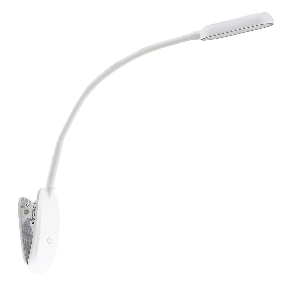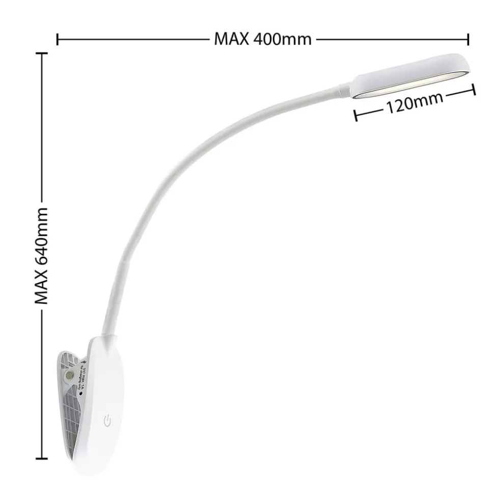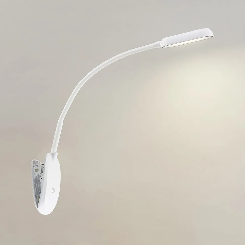 Witte LED klemlamp Najari met traploos dimmen, USB-aansluiting De LED klemlamp Najari heeft een eenvoudig ontwerp. Het heeft een flexibele lampenarm en een ovaalvormige lampenkop van kunststof en een praktische klem. Dit betekent dat de lamp op verschillende plaatsen kan worden gebruikt – bijvoorbeeld als leeslamp bij een bed of als werklamp aan een tafel. De klemlengte is 5 cm en de lichtomstandigheden kunnen individueel worden aangepast dankzij de traploze dimfunctie. De witte afwerking ziet er stijlvol uit en past perfect bij verschillende kleurenschema’s. De batterij wordt opgeladen via de USB-poort.