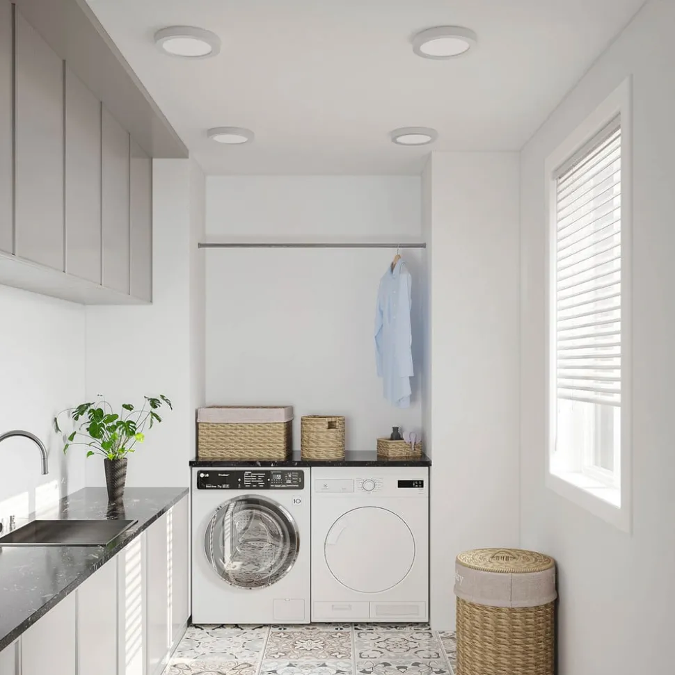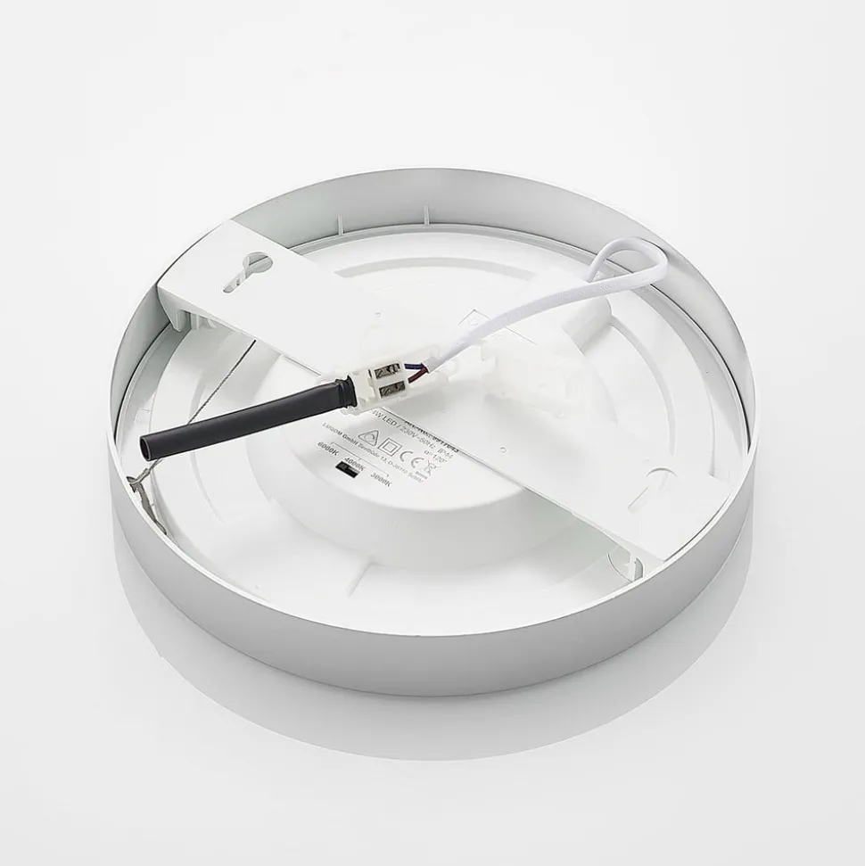Edwina ronde LED plafondlamp met zilverkleurig frame en beschermingsgraad IP44, instelbare lichtkleur – in een praktische set van 2 Deze plafondlamp met vast geïnstalleerde LED’s is een klassieke allrounder voor vele gelegenheden. Met een DIP-schakelaar op de behuizing kan vóór installatie een van de drie lichtkleuren worden geselecteerd – afhankelijk van wat het beste past bij de locatie en het doel. De LED’s geven helder licht met een laag energieverbruik en zijn daarom bijzonder efficiënt. Indien nodig kan de lichtintensiteit worden aangepast met een externe dimmer. Bovendien biedt de beschermingsgraad IP44 een goede beschermingsgraad tegen vocht, wat betekent dat Edwina ook kan worden gebruikt om vochtige ruimtes te verlichten. De LED plafondlamp kan goed worden gebruikt in zowel commerciële als privéomgevingen en het ronde ontwerp met zilveren frame oogt aangenaam discreet en veelzijdig. – instelbare lichtkleur (DIP-schakelaar) – IP44-beschermingsgraad voor badkamers en vochtige ruimtes – extern dimbaar – de armatuur wordt geleverd in een set van 2