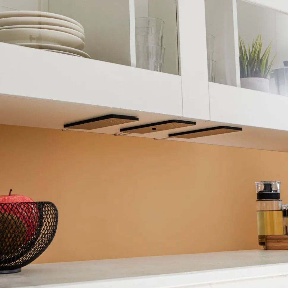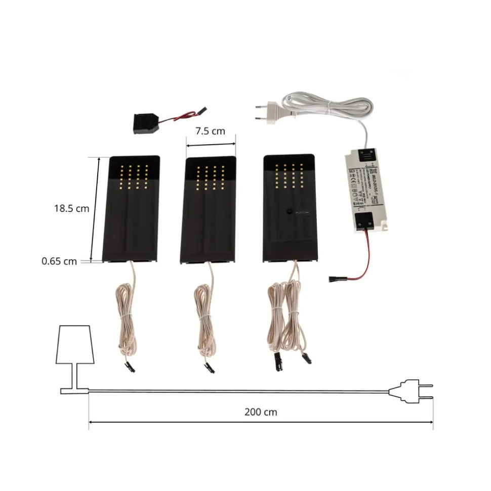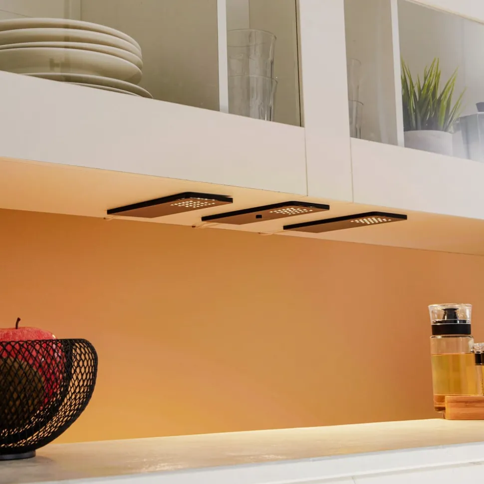 Moderne, zwarte Rixa LED onderbouwlamp in een praktische set van 3 – ideaal voor de keuken Als je op zoek bent naar een moderne lichtbron voor keukenbovenkasten, is deze set van drie onderbouwlampen de perfecte keuze, omdat hij volledig zwart is en een hoekig ontwerp heeft. De hoofdlamp draagt de schakelaar en is verbonden met de verdeler waarop de andere twee lampen zijn aangesloten. Alle lampen worden bediend via de schakelaar op de hoofdlamp. Met zijn heldere maar energiezuinige licht is de Rixa LED meubelverlichting een praktische aanwinst voor veel keukens en verlicht hij werkbladen helder genoeg voor al het werk dat in een keuken gedaan moet worden. Natuurlijk kunnen ook andere werkbladen of zones verlicht worden met deze set, op voorwaarde dat er een wandkast of plank beschikbaar is voor installatie. De aansluiting gebeurt via een eurostekker en is dus in één stap klaar.