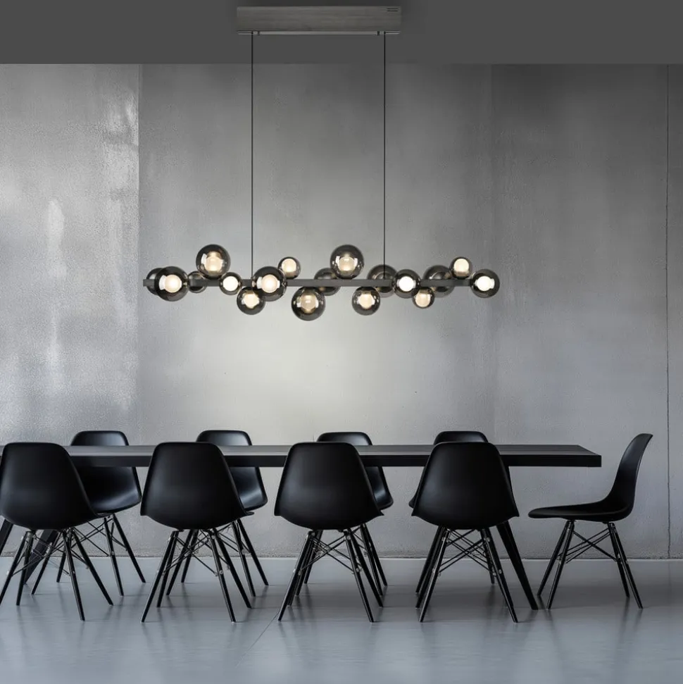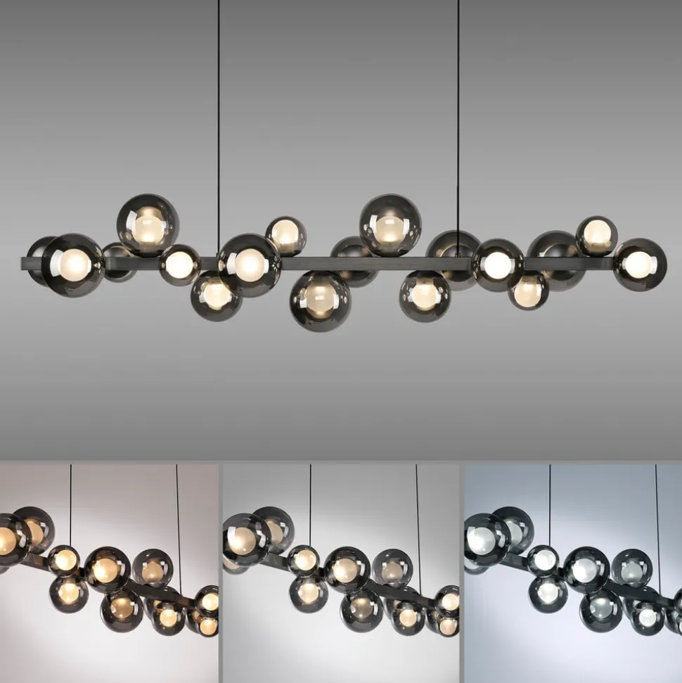 LED hanglamp E-Popup met 18 glazen kappen – CCT-functie, elektrisch in hoogte verstelbaar Flexibel verstelbaar, decoratief en veelzijdig voor gebruik in moderne woonconcepten – zo presenteert de LED hanglamp E-Popup zich. Ze is uitgerust met 18 bolvormige glazen kappen die elk verdeeld zijn in een buitenste, transparante bol en een binnenste, gesatineerde bol. De LED’s die in de bollen zijn geïntegreerd, kunnen worden gedimd en de lichttemperatuur (2.700 tot 5.000 K) kan worden aangepast met de meegeleverde afstandsbediening. De e-LIFT-functie maakt ook een elektrisch aangedreven hoogteverstelling mogelijk; de elektronica bevindt zich in de baldakijn. Na het opnieuw inschakelen is de laatst gekozen instelling weer beschikbaar (geheugenfunctie).