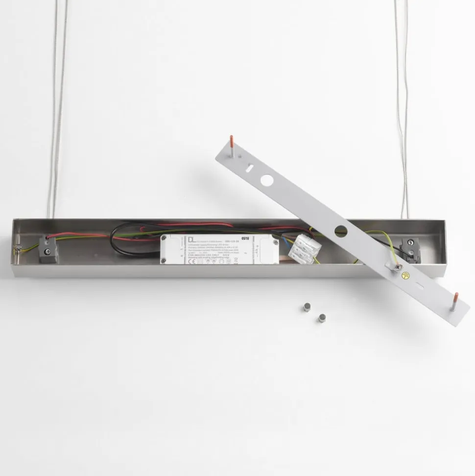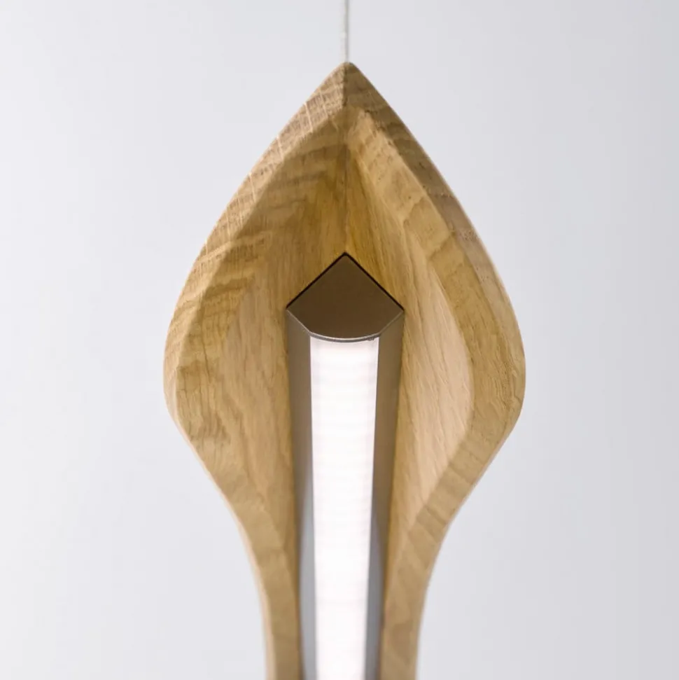 LED hanglamp Hiba met eiken kap in dakvorm, dimbaar en in hoogte verstelbaar Hiba is een uitstekend verlichtingselement voor moderne woonruimtes en ook voor ruimtes die een Scandinavisch design volgen dat staat voor gezelligheid en een duidelijke, stijlvolle designtaal waarin minder meer is. Als je de Hiba LED hanglamp bekijkt, zal zelfs een leek snel beseffen dat beide punten perfect van toepassing zijn. De kap – zeker geen gewoon exemplaar in zijn soort – is volledig gemaakt van massief, lichtgekleurd eikenhout met een met de hand afgewerkt oppervlak dat niets van zijn natuurlijke uitstraling verliest en de nerf van het hout blijft volledig intact. De hoogte van het armatuur kan naar wens worden aangepast (105-195 cm) met behulp van een trekkabelconstructie en dit, samen met de langwerpige vorm en het naar beneden gerichte licht, is een kenmerk dat Hiba voorbestemt voor gebruik boven een eettafel. Indien gewenst kan er ook een dimmer worden geïnstalleerd (faseaansnijding) en kan de helderheid optimaal worden geregeld om zowel een kaarslichtsfeer als een heldere taakverlichting te creëren. Een hoge kleurweergave-index (CRI > 90) en de zeer goede efficiëntie van de warmwitte, flikkervrije LED’s ronden de voordelen op technisch niveau af, zodat je kunt profiteren van een zeer hoogwaardig verlichtingsproduct dat zowel visueel als qua technologie absoluut indrukwekkend is. De aansluitruimte in de plafonddoos is extra groot voor een gemakkelijke installatie. Beste kwaliteit made in Germany!