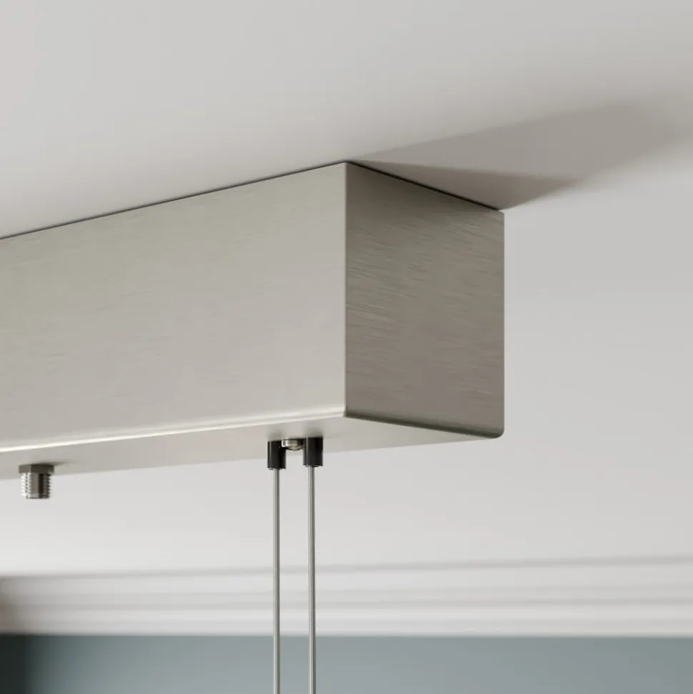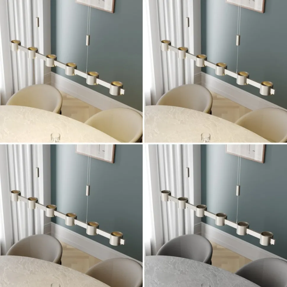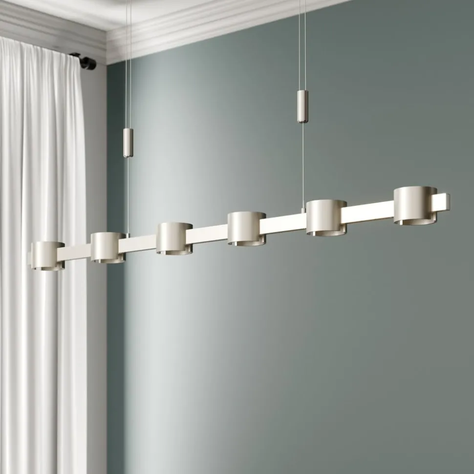 Hoogwaardige LED hanglamp Niro in een elegante nikkelafwerking – dimbaar en in hoogte verstelbaar De LED hanglamp Niro is de perfecte keuze voor iedereen die zich bij het inrichten van zijn ruimte niet wil beperken tot ronde of hoekige vormen. Dit komt omdat ze ronde en hoekige vormen in gelijke mate combineert en zo een grote verscheidenheid aan ontwerpconcepten bedient. De oppervlakteafwerking van de armatuur heeft ook een neutrale uitstraling. De afwerking in mat nikkel is eenvoudig, tijdloos en ziet er altijd zeer elegant uit. Een rechthoekige aluminium buis vormt de basis van het armatuur, die wordt aangevuld door zes ronde buislampen die op regelmatige afstanden aan de buislamp zijn bevestigd. Deze bieden ruimte aan de ingebouwde Citizen LED’s, die verantwoordelijk zijn voor het homogene licht dat Niro uitstraalt. Om niet alleen een gecentreerd licht naar beneden te geven, maar het licht ook wat verder in de omgeving te verspreiden, zijn de afzonderlijke lichtlichamen voorzien van zijdelingse openingen waardoor het licht kan ontsnappen. De hele structuur wordt op haar plaats gehouden door twee stalen kabelophangingen met een geïntegreerd mechanisme voor hoogteverstelling dat met één enkele beweging kan worden bediend. Dankzij de dimbaarheid via een leading edge of trailing edge fasedimmer kan de Niro hanglamp worden gebruikt om de meest uiteenlopende verlichtingssferen in de woonkamer te creëren. Terwijl de lamp ideaal is om op maximale helderheid te werken, kan het licht in de avonduren worden gedimd om gezellig samen te zitten met familie of vrienden. Dankzij de uitstekende functionaliteit is Niro een armatuur die niet alleen rekening houdt met het praktische aspect van pure verlichting, maar ook het decoratieve doel dat een lichtbron moet vervullen niet verwaarloost. Daarnaast scoort het zonder twijfel met goede kwaliteit, precieze afwerking en duurzame technologie.