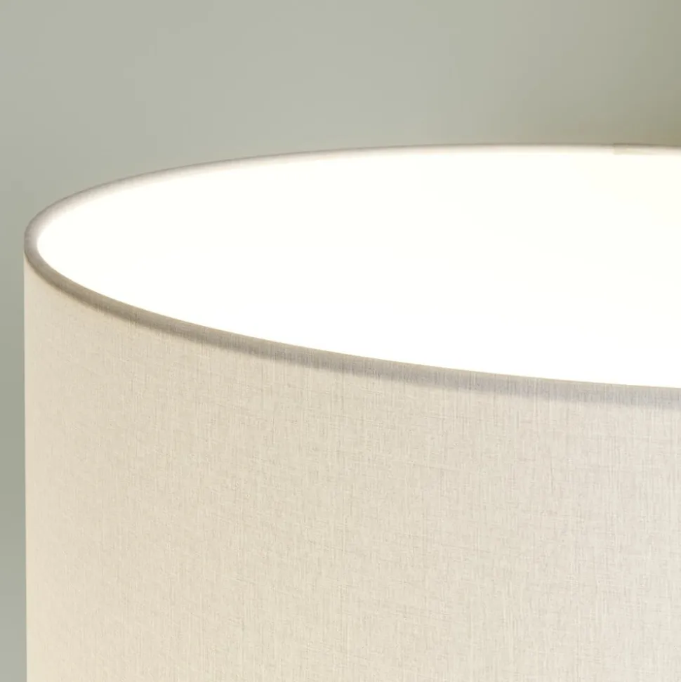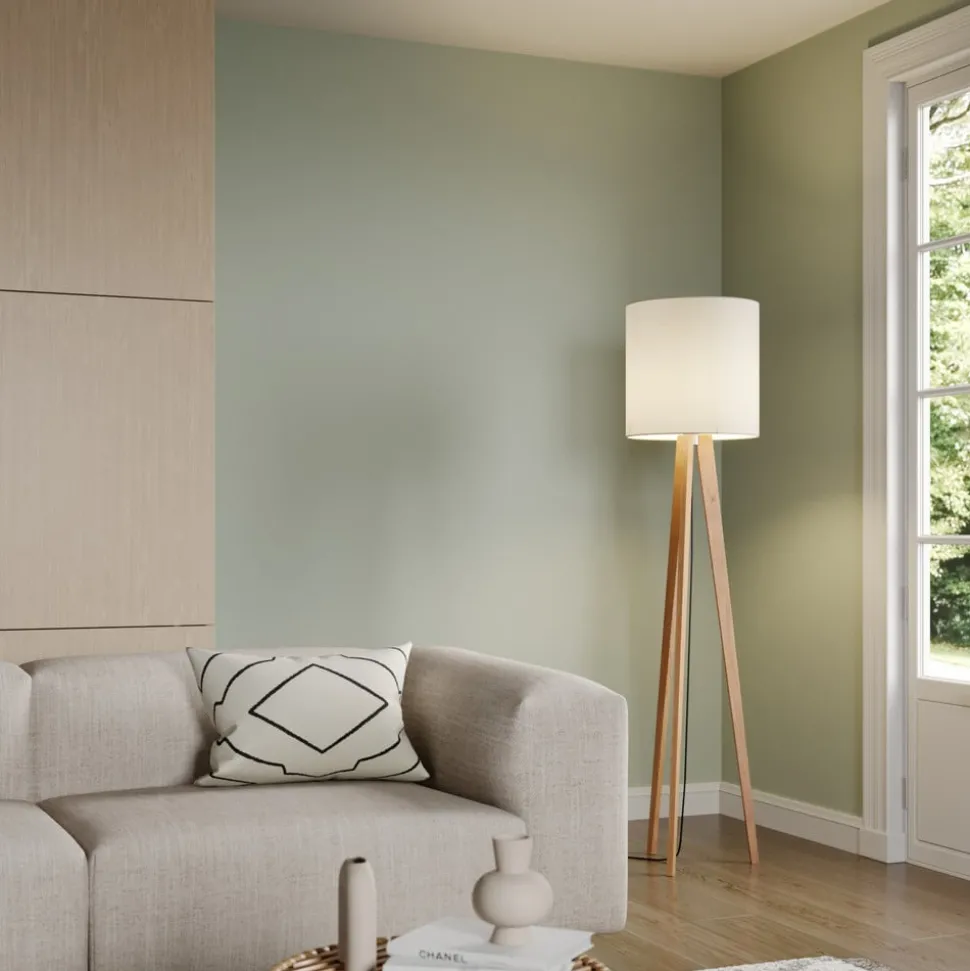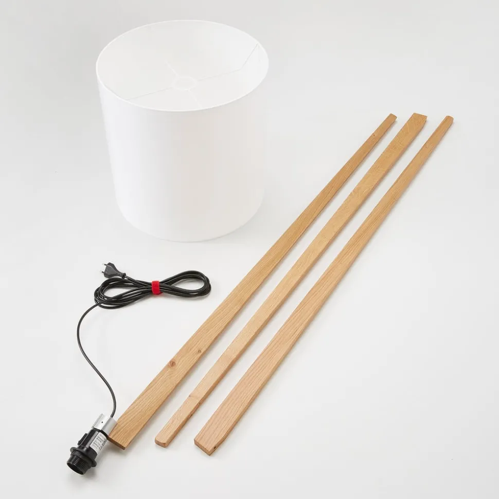 Nida houten vloerlamp met witte kap en elegant houten frame in eikenhout – een verlichtingsproduct gemaakt in Duitsland Nida maakt indruk met een zeer modern ontwerp. De kap is cilindervormig en wordt aangevuld door een houten frame met drie poten, dat trendy is en associaties oproept met de Scandinavische woonstijl. De hoogwaardige vloerlamp van Duitse makelij zorgt ook voor een warm, zacht en gezellig licht, dat wordt gegenereerd door de witte chintz-kap. De backingfolie onder de chintz-stof is alleen brandvertragend met bouwmateriaalklasse B1 en draagt daarom bij aan meer veiligheid in de woonomgeving. De armatuurschakelaar bevindt zich op de lamphouder, wat een snelle bediening mogelijk maakt en gemakkelijk toegankelijk is. De voedingskabel van de vloerlamp van vloerstof met het houten frame is zwart en omdat de lamp grotendeels met de hand wordt gemaakt in Duitsland, kan een hoge afwerkingskwaliteit worden gegarandeerd, zodat consumenten met een uitgesproken gevoel voor kwaliteit snel overtuigd zijn.