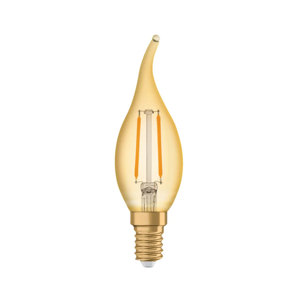 LED windblast lamp E14, 2,5 W, goudDe Essence Ambiente LED kaarslamp met E14 voet in windblast look en met zichtbare gloeidraden is bijzonder geschikt voor gebruik in kroonluchters en armaturen zonder kap. Dankzij zijn design is hij opvallend en decoratief, de goud-heldere glazen lamp in combinatie met de zeer warme lichtkleur realiseert een gezellige sfeer.- warm wit (2.400 K)
