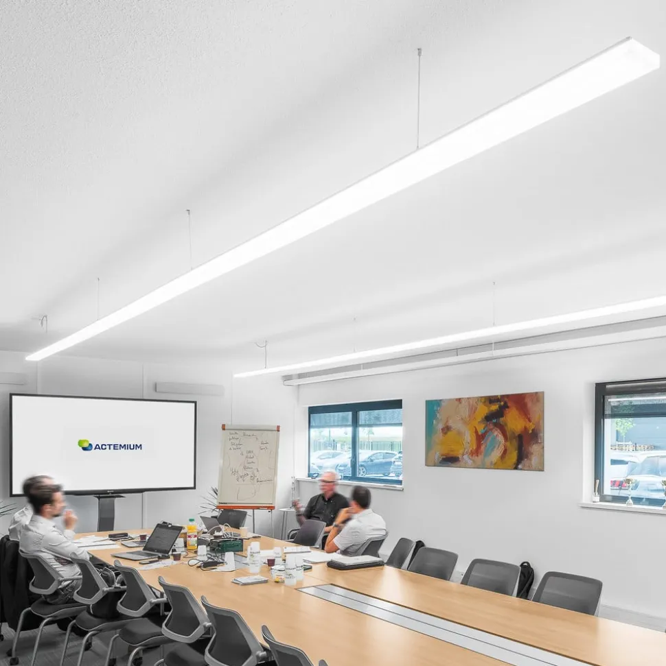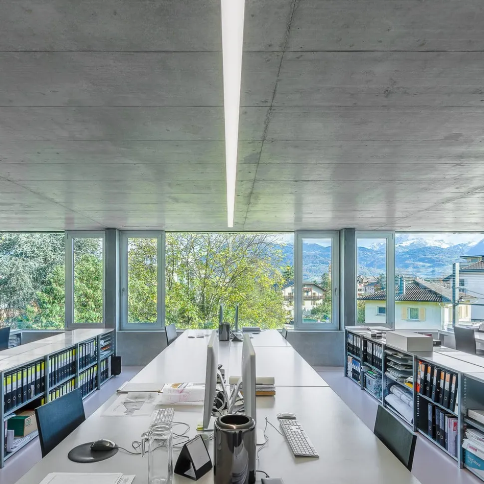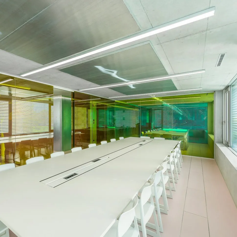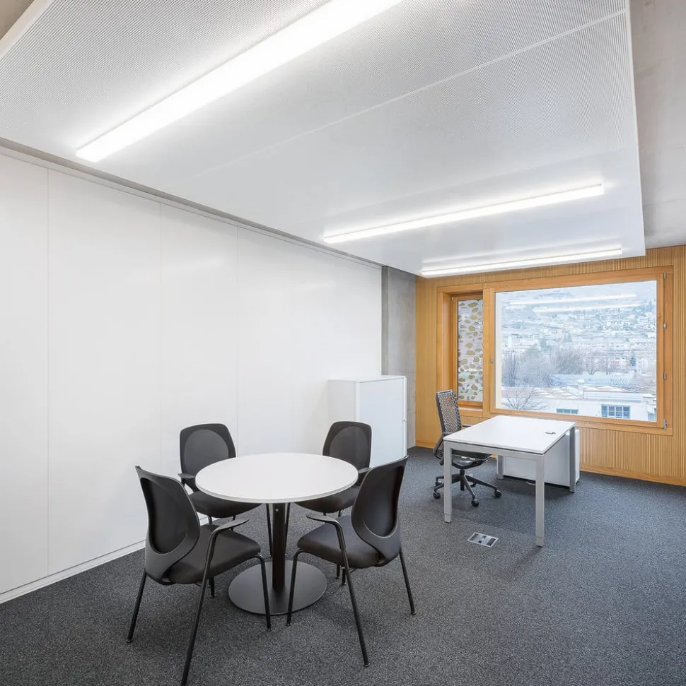 De Purelite Office opbouwarmatuur is een zeer efficiënte LED-latarmatuur met een behuizing van natuurlijk geanodiseerd aluminium en een kunststof diffuser (microprismatische CLD – Controlled Luminance Diffuser). Een gecertificeerde MINERGIE® module van de fabrikant Regent is geïnstalleerd. Purelite Office zorgt voor effectief, allround licht met weinig verblinding, dat ook het plafond verlicht. Dit zorgt voor een adequate verlichting van de ruimte met een schaduwvrije lichtlijn. De DALI-dimbare voorschakelapparatuur is bij de armatuur inbegrepen.