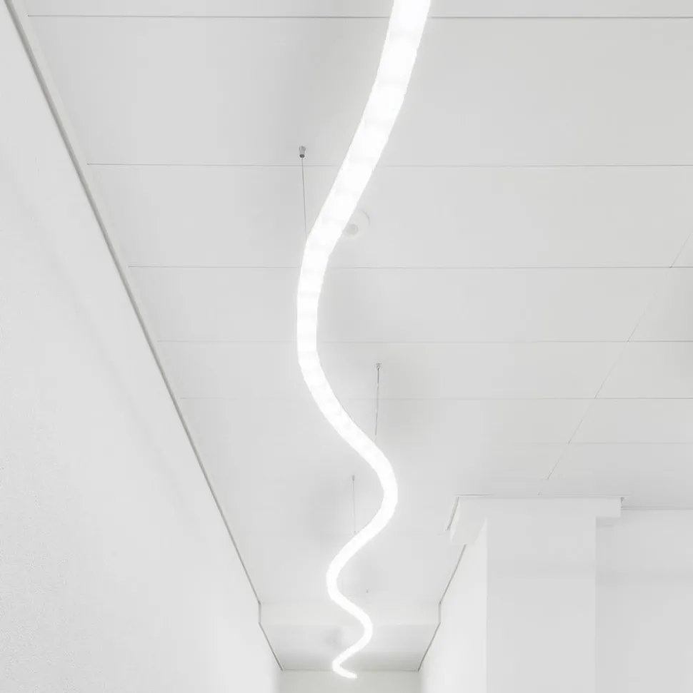 Met de LED-lichtband Wiggle kunnen individueel afgestemde lichtverhoudingen worden gecreëerd. Het bestaat uit afzonderlijke elementen die continu in een lijn kunnen worden geplaatst of tegen elkaar kunnen worden gedraaid om een zwierige figuur te vormen. Het licht wordt diffuus en rechtstreeks in de kamer uitgestraald. De lichtkleur kan worden aangepast van warm wit (2.700 K) tot daglicht (6.500 K) om op elk moment de gewenste sfeer te creëren. Een koordophanging voor gebruik als pendelarmatuur kan apart worden besteld via de accessoires.