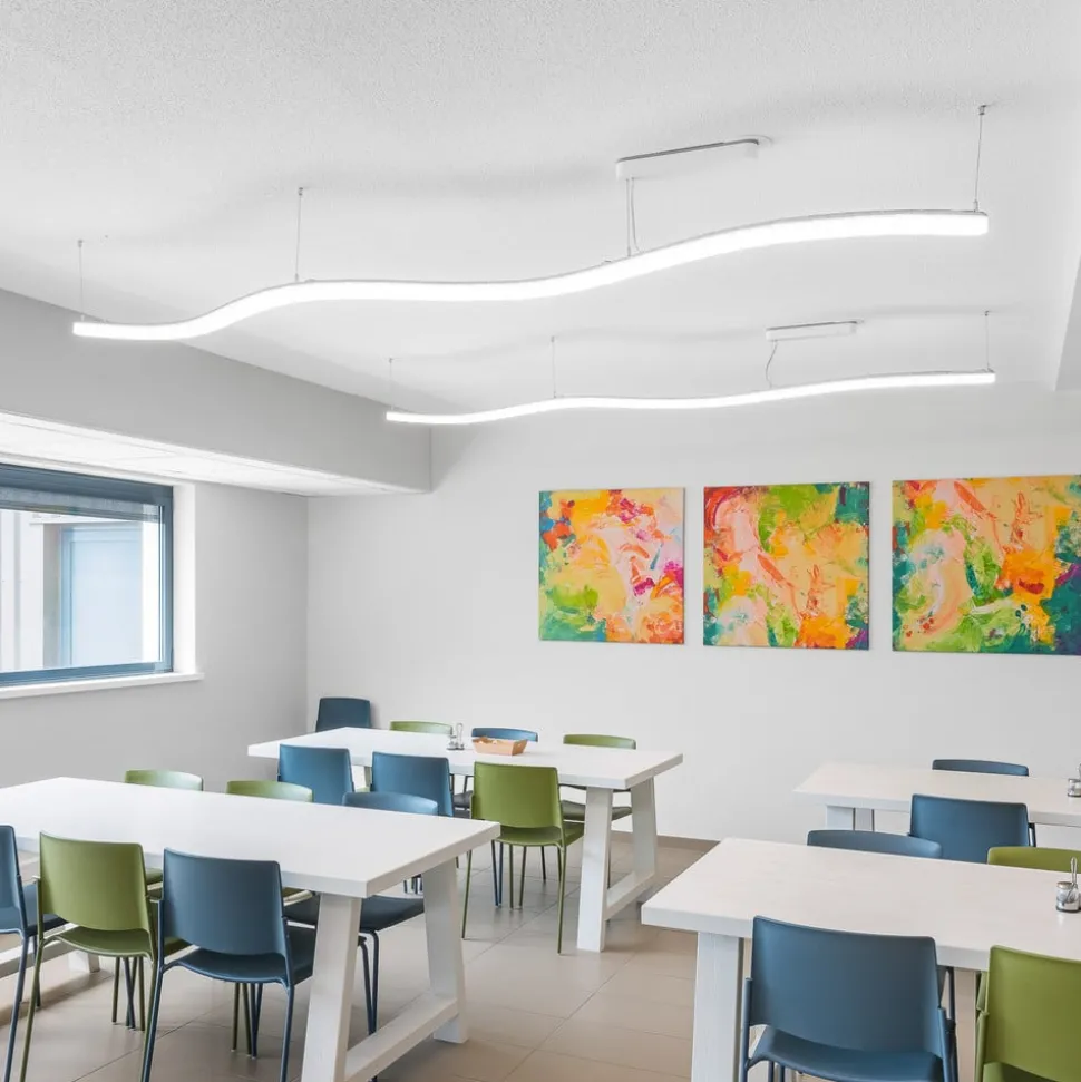 Met deze lichtstrip, die zowel aan het plafond als aan de wand kan worden gemonteerd, kan elke ruimte effectief en tegelijkertijd gevarieerd worden verlicht. Het bijzondere aan Wiggle is dat het bestaat uit elementen die tegen elkaar kunnen worden gedraaid en gemonteerd om ofwel een rechte lijn ofwel vloeiende bochten te creëren. Het licht wordt rechtstreeks in de kamer uitgestraald. De vereiste, extern DALI-dimbare voorschakelapparatuur is reeds bij de levering inbegrepen. Gebruik als pendelarmatuur is mogelijk met een apart verkrijgbare ophangset (zie accessoires).