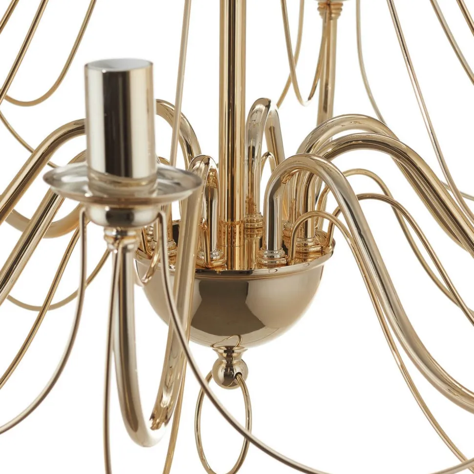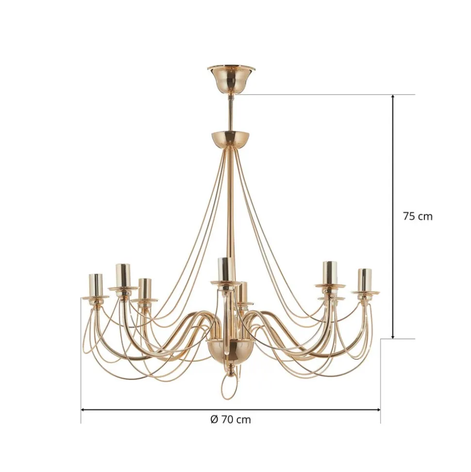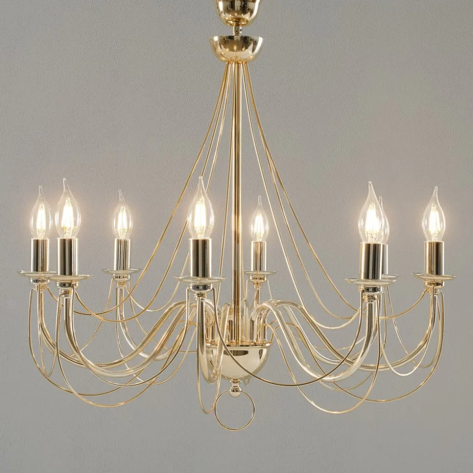 Het gouden glanzende oppervlak van kroonluchter Retro maakt hem tot een zeer opvallende en decoratieve lichtbron. De stijlvol gebogen armen vormen een prachtig totaalbeeld. Vooral in luxe inrichtingsstijlen heeft past deze lamp goed. De in totaal acht lampen die niet worden meegeleverd kunnen via de accessoires worden besteld.