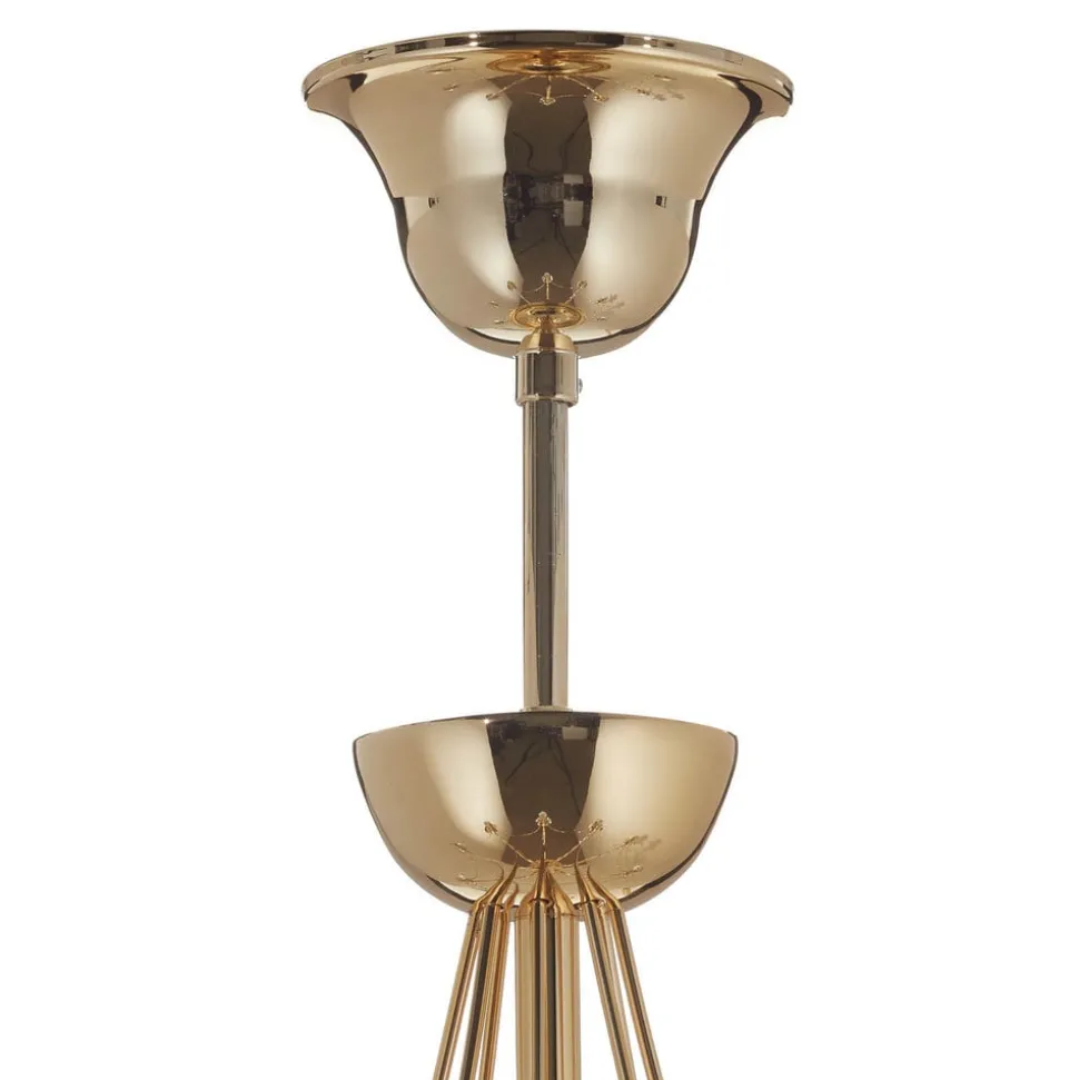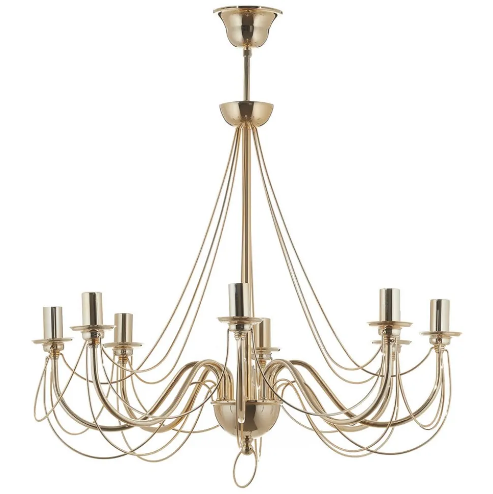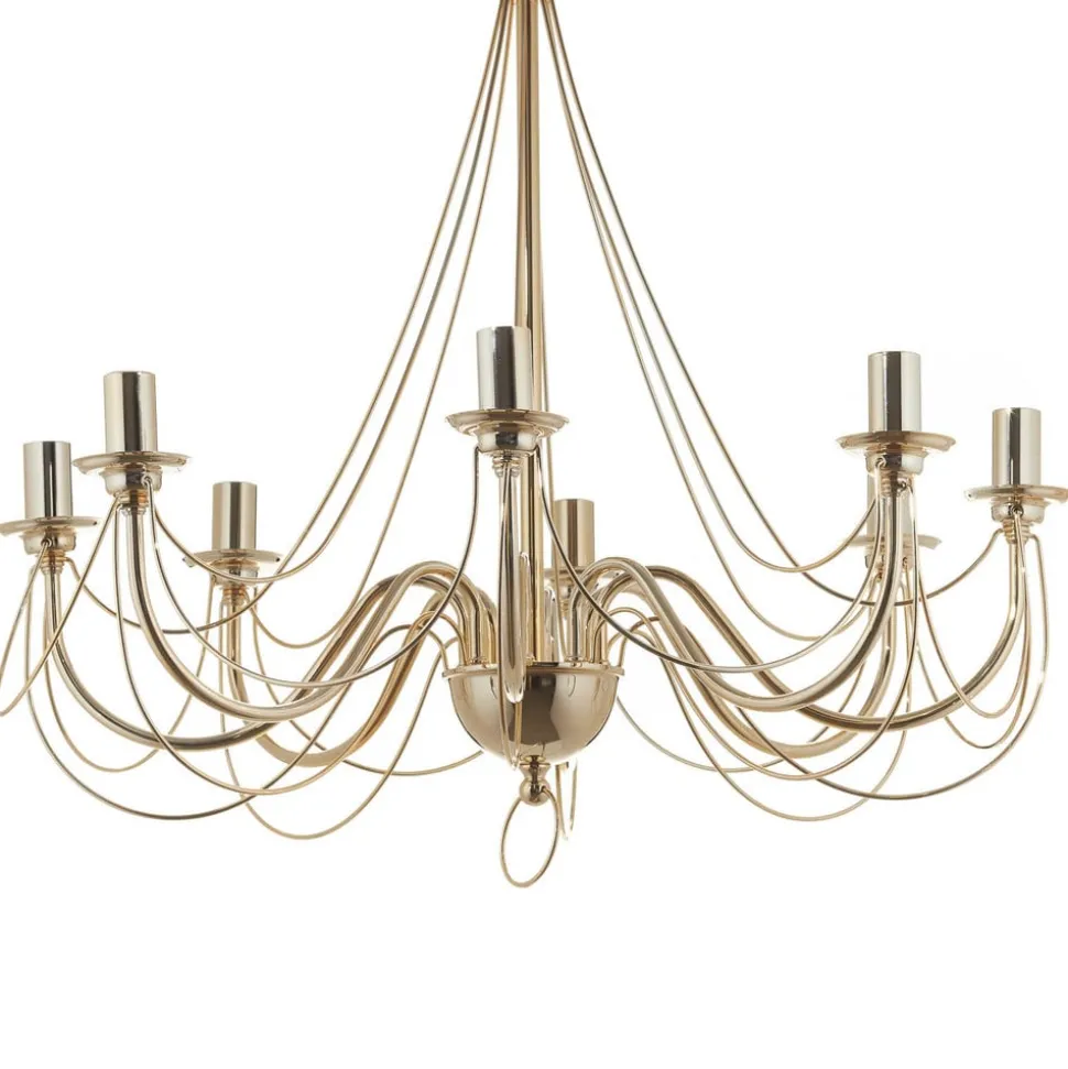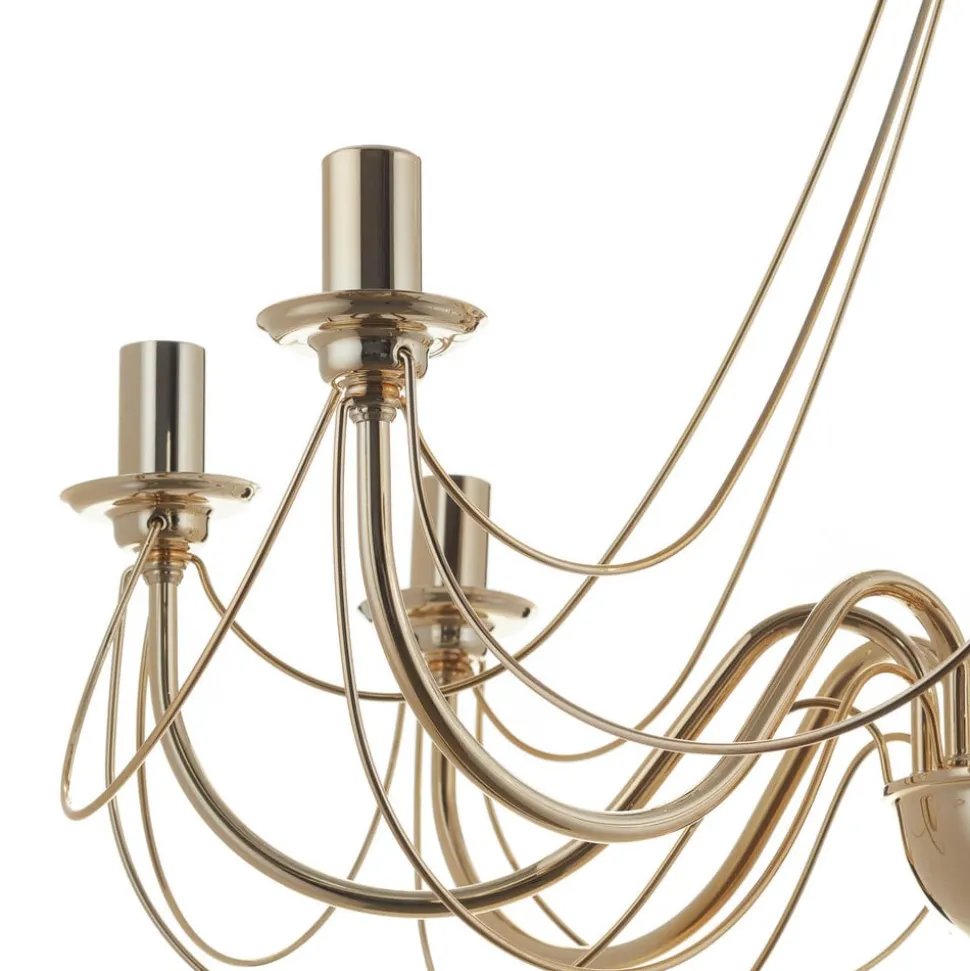 Het gouden glanzende oppervlak van kroonluchter Retro maakt hem tot een zeer opvallende en decoratieve lichtbron. De stijlvol gebogen armen vormen een prachtig totaalbeeld. Vooral in luxe inrichtingsstijlen heeft past deze lamp goed. De in totaal acht lampen die niet worden meegeleverd kunnen via de accessoires worden besteld.