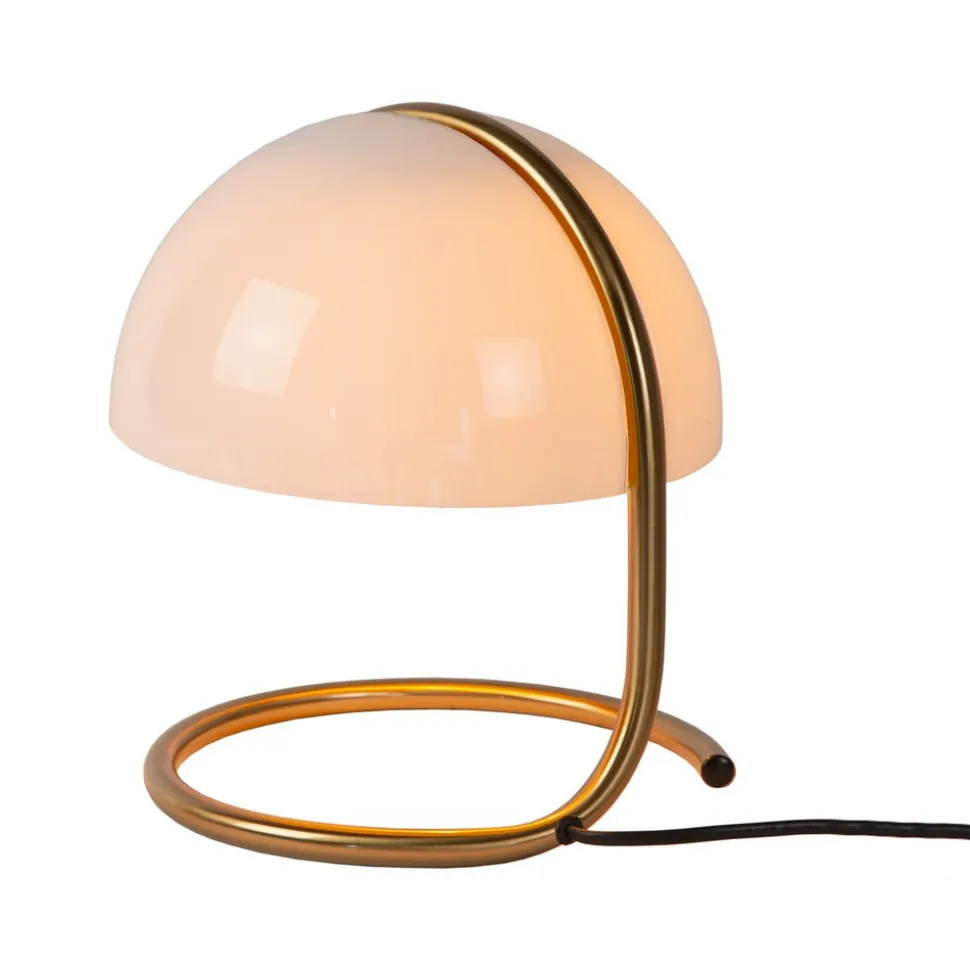 Elegante retro tafellamp Cato voor op de vensterbankCato is een kleine, discrete tafellamp met een opvallend ontwerp. De halfronde kap van matglas is ondoorzichtig en verspreidt een diffuus licht in de omgeving. De sierlijke, gebogen voet in messingkleurige optiek biedt goede stabiliteit en maakt het harmonieuze uiterlijk compleet.