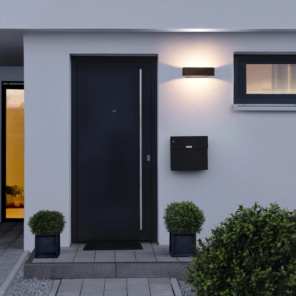 De LED-buitenwandarmatuur HB 103 is de perfecte keuze voor indirecte verlichting langs de gevel of naast de ingang in een moderne omgeving. De armatuur is gemaakt van gegoten aluminium met poedercoating in antraciet metallic en heeft de vorm van een brede, frontaal afgeronde kubus die aan de boven- en onderzijde open is. De LED’s zijn achter het front geïntegreerd. Het warmwitte licht wordt naar achteren en naar de omringende wand uitgestraald, zodat de omgeving aangenaam wordt verlicht zonder te verblinden en er een aantrekkelijk lichteffect op de wand ontstaat.