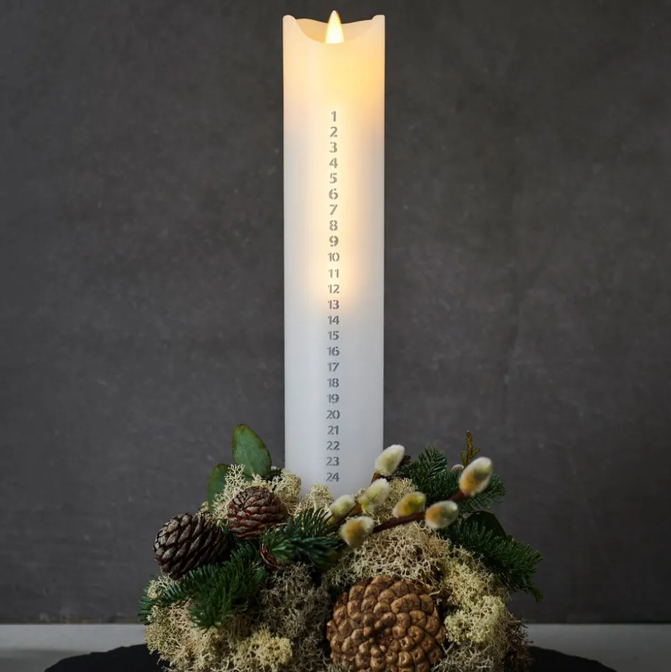 Sara Kalender LED waskaars met kerst aftellen De Sara Kalender LED kaars is de ideale decoratieve lichtbron voor de kerstperiode met zijn romantische patroon van stippen en sterren en in het bijzonder de rij cijfers van 1 tot 24 die van boven naar beneden loopt. De hoogte van het licht kan worden geregeld met de afstandsbediening, zodat de rij getallen kan worden gebruikt om af te tellen naar de feestdagen. De hoge kaars is gemaakt van lichtgekleurde was. De gesmolten rand en het flikkerende licht geven Sara Calendar extra authenticiteit. Dankzij de LED-lichtbron is er geen brandgevaar van een echte kaarsvlam – afstandsbediening inbegrepen – werkt op batterijen: Kaars en afstandsbediening elk 2 x 2 AA (niet inbegrepen) – Maximale omgevingstemperatuur: 30 °C