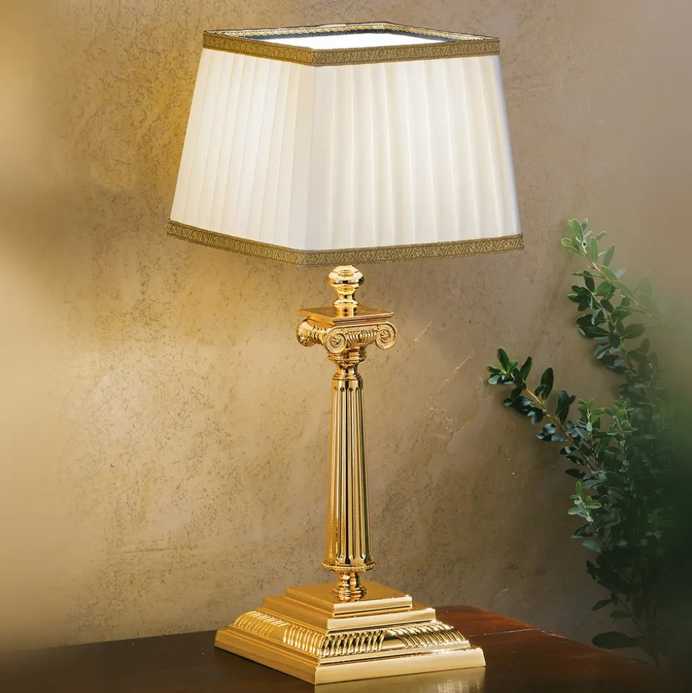 Sarafine komt als tafellamp door en door klassiek over. Dat blijkt vooral uit de combinatie van een wit, geplisseerde kap met een vergulde voet met heel veel details. De artistieke vormgeving van de metalen elementen doet denken aan rijke gebouwen uit de Griekse oudheid, maar ook aan bokalen waarmee kampioenen worden geëerd. In ieder geval een zeer stijlvolle verlichting voor alle ruimten met een klassiek interieur.