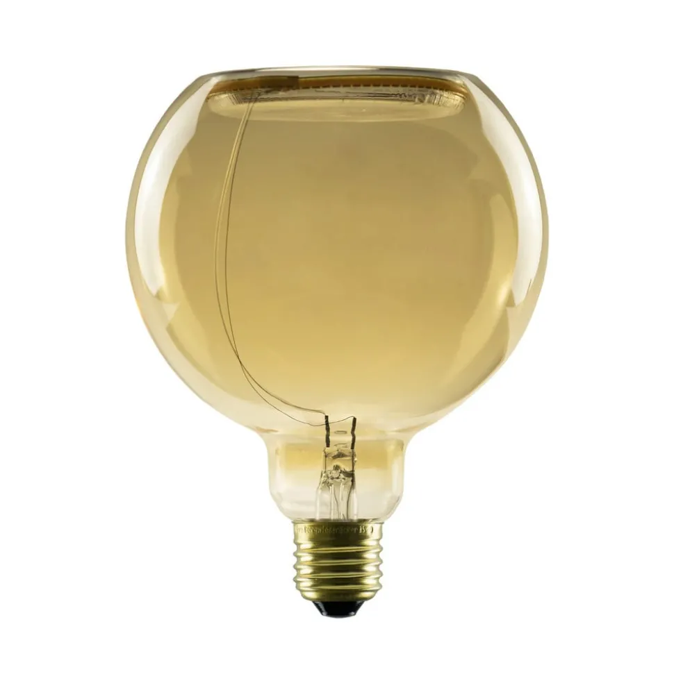 Uit de Floating serie: LED globe lamp E27 G125 4W met goud getint, gesloten glas, dimbaar Naast haar ongewone maar zeer decoratieve uiterlijk, wordt deze LED globe lamp vooral gekenmerkt door haar zeer warme lichtkleur in combinatie met het goud getinte glas, evenals haar dimbaarheid met de meeste in de handel verkrijgbare dimmers. Ze is bijzonder geschikt voor armaturen zonder kap en zal overtuigen door haar lichteffect, mede dankzij haar hoge kleurweergave. Deze gloeilamp uit de floating serie van SEGULA is vervaardigd met een dubbelwandig glas met een gouden tint en een gepatenteerde LED-soft gloeidraad die erin is ingebouwd als ring. Dimbaar met de meeste in de handel verkrijgbare dimmers – Met gesloten glas, dus geschikt voor buitengebruik in combinatie met een waterdichte lamphouder – Zeer goede schakelbestendigheid (100.000 schakelcycli) – IP65 – Bekroond met de Plus X Award 2022/2023 in de categorieën innovatie, hoge kwaliteit en design
