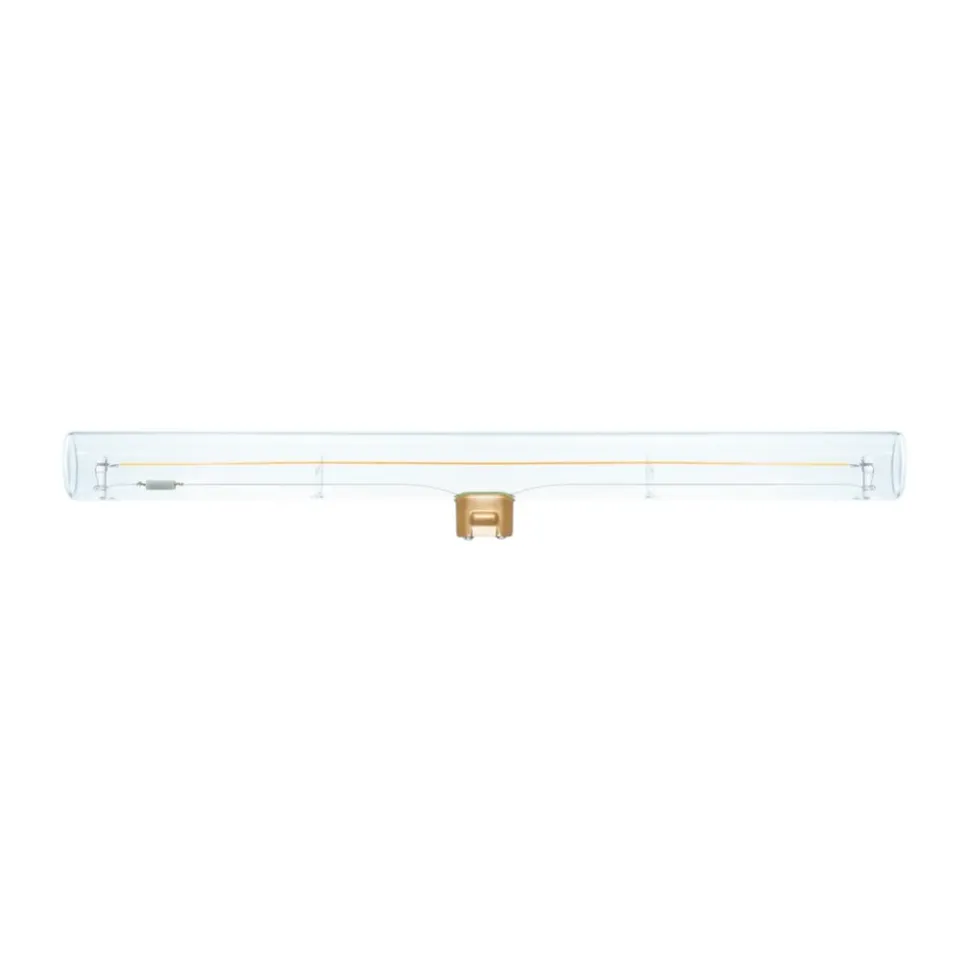 LED lineaire lamp S14d lengte 30 cm 4,5W 2.200 K. Deze LED lineaire lamp met S14d lampvoet geeft extra warmwit licht dankzij de LED filamenten die erin zijn geïnstalleerd. Deze zitten in een transparante glazen lamp, waardoor hun licht zeer aangenaam schijnt met een warmwitte lichtkleur van 2.200 K. – Bijzonder hoge kleurweergave van Ra >90 – Dimbaar met veel gangbare dimmers, bijv. GIRA, ELTAKO, Jung en anderen.