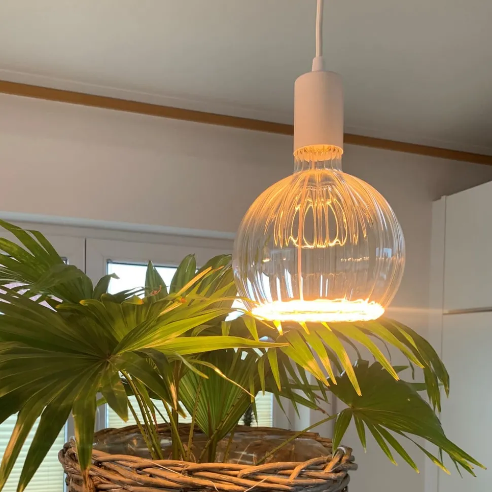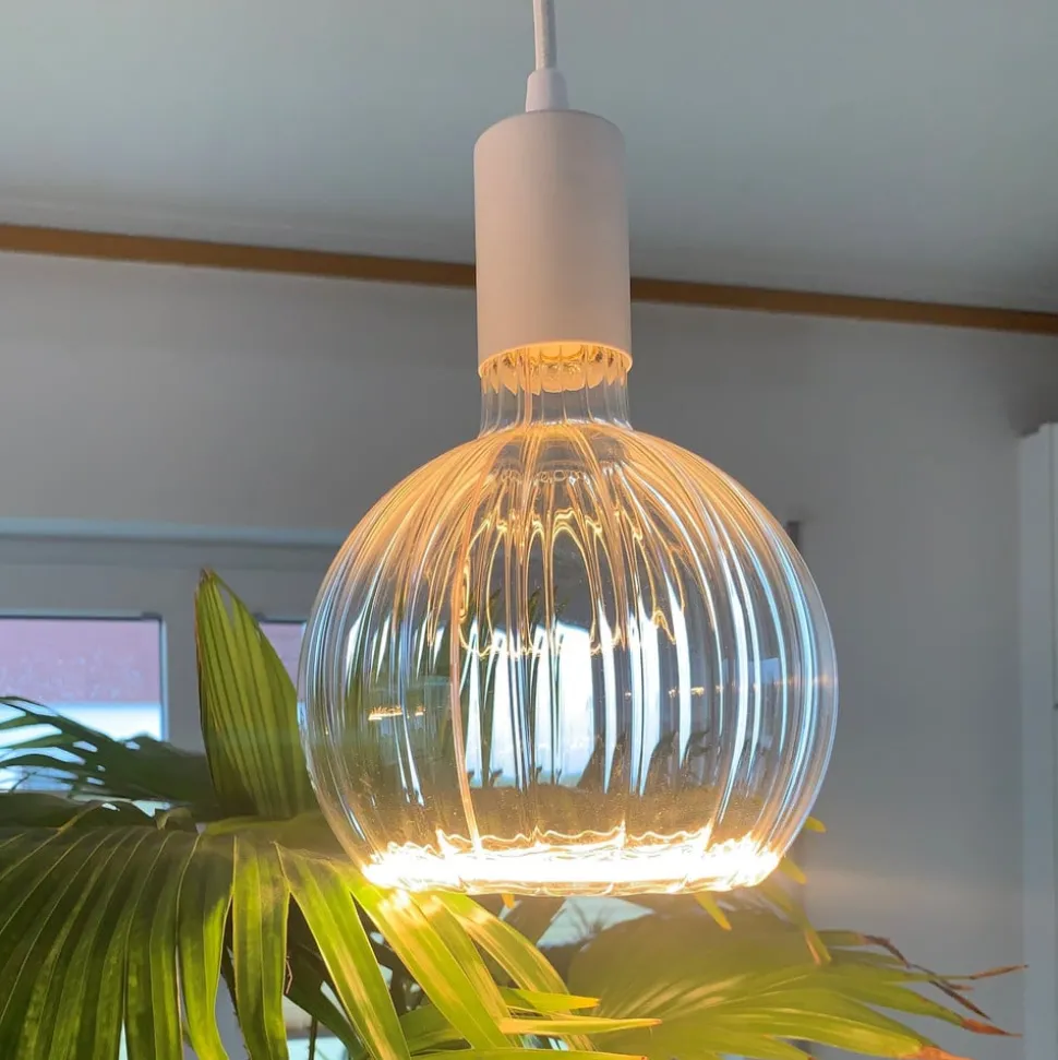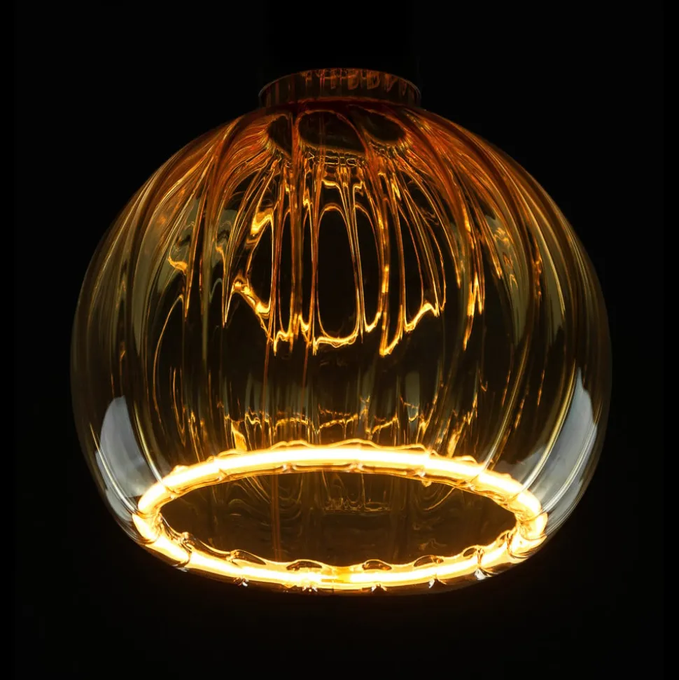 Decoratieve LED zwevende gloeilamp G150, E27, 4W recht goudDe grote LED zwevende gloeilamp heeft een goudkleurig glas met verticale strepen aan de buitenkant. De warme kleur van het glas zorgt voor een gezellige noot in de woonruimte. De LED globe lamp is prachtig geschikt voor gebruik in open vormgegeven armaturen, bijvoorbeeld pendelarmaturen zonder kap. De lichtsterkte kan worden geregeld met een compatibele externe fasedimmer.- warme lichtkleur met 2.200 K- dimbaar met ELTAKO, Jung, GIRA- zeer goede kleurweergave Ra 90- bekroond met de Plus X Award 2022/2023 in de categorieën Innovatie, Hoge Kwaliteit en Design.