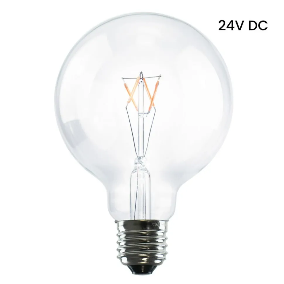 LED globe lamp E27 3W filament 2.700K voor de 24V netspanning Deze LED globe lamp maakt deel uit van de Nautic Line van Segula, een lampenserie die speciaal ontwikkeld is voor direct gebruik in de 24V netspanning. Deze netspanning vind je bijvoorbeeld in campers of op woonboten. De lamp van helder glas schijnt in een aangename warmwitte lichtkleur en is dimbaar. De lamp is uitgerust met omgevingsdimming, waardoor de lichttemperatuur wordt verlaagd wanneer deze wordt gedimd (van 2.700 K bij volle lichtsterkte tot 2.000 K wanneer deze wordt gedimd).