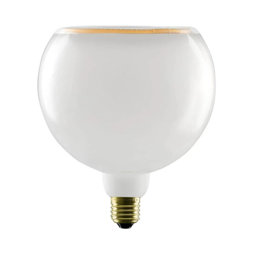 E27 LED lamp Floating, Ø 15 cm, 6 W, witte glazen bol Deze LED lamp uit de Floating serie is voorzien van een witte glazen bol in een grote G150 bolvorm, die aan de andere kant dan de voet open is. De diodes zijn geïntegreerd in de ringvormige opening. De metalen E27 voet heeft een gouden afwerking en de gepatenteerde soft filament technologie en aantrekkelijke lichtreflecties geven de lamp extra decoratieve waarde. Ideaal voor open armaturen zonder kap of lamphouderarmaturen – extern dimbaar (trailing edge) – extra warmwit licht – goede kleurweergave (CRI 90) – handgemaakte glazen lamp